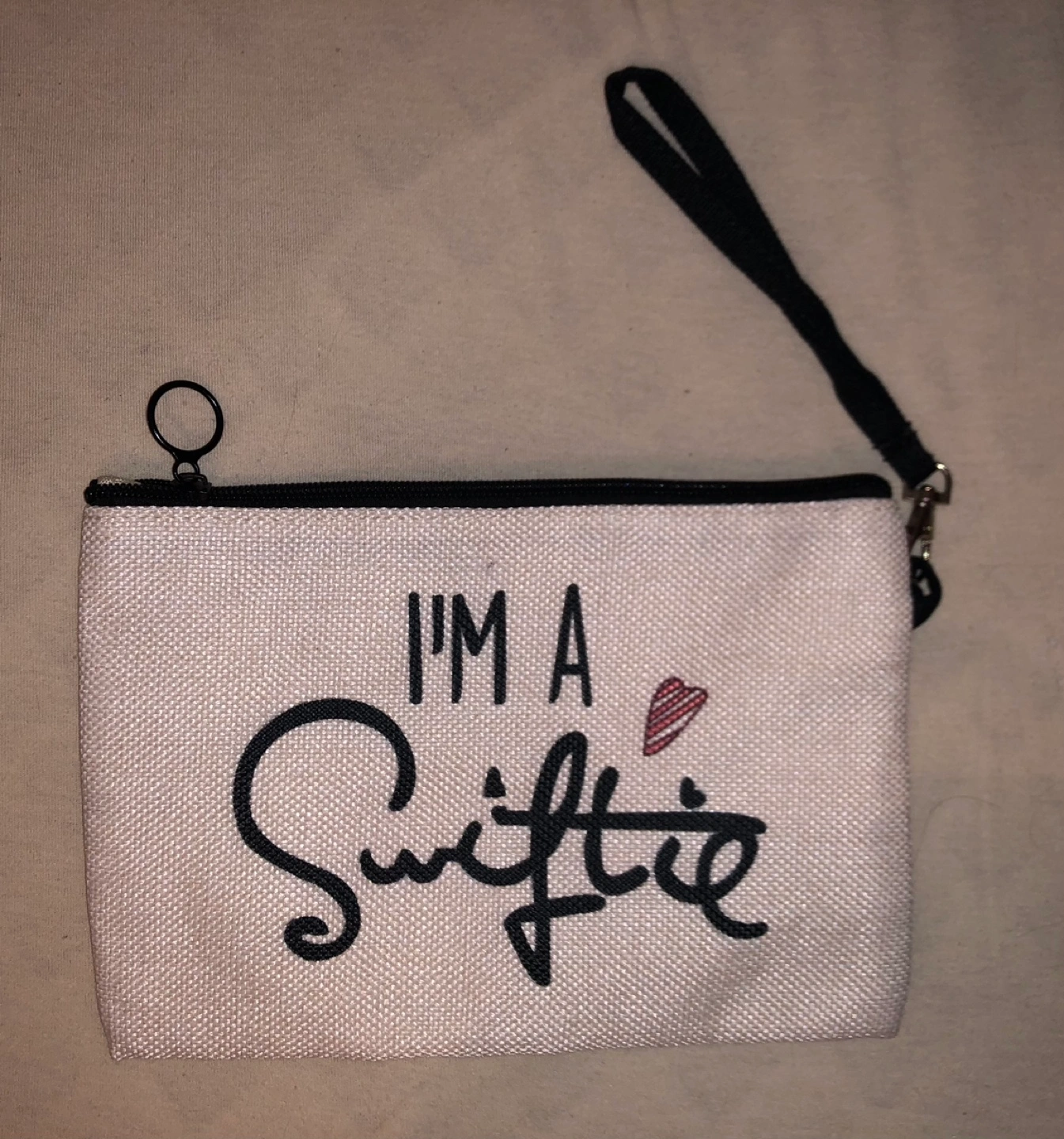 Small zippered makeup bag with a black strap. Features a white canvas exterior with black text that says "I'm A Swiftie". Comes in a clear bag. Never used.
