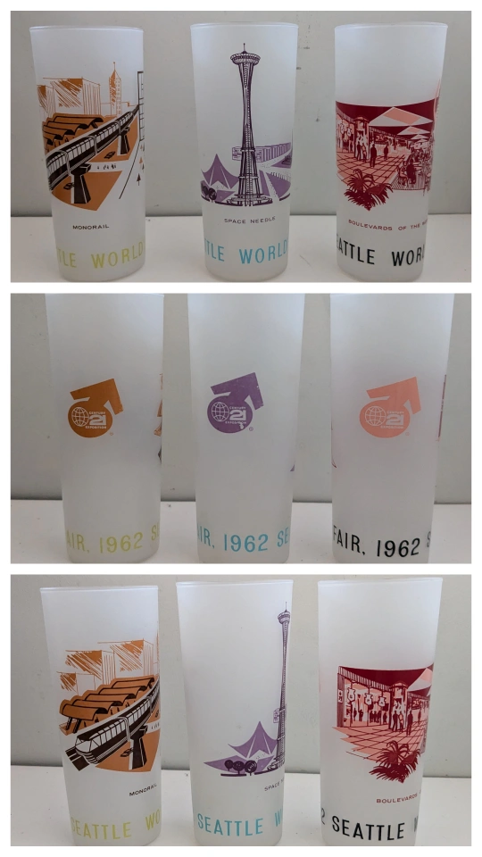 2613 Seattle Worlds Fair Highball glasses 1 with Monorail 1 with Space needle 1 with boulevards of the world