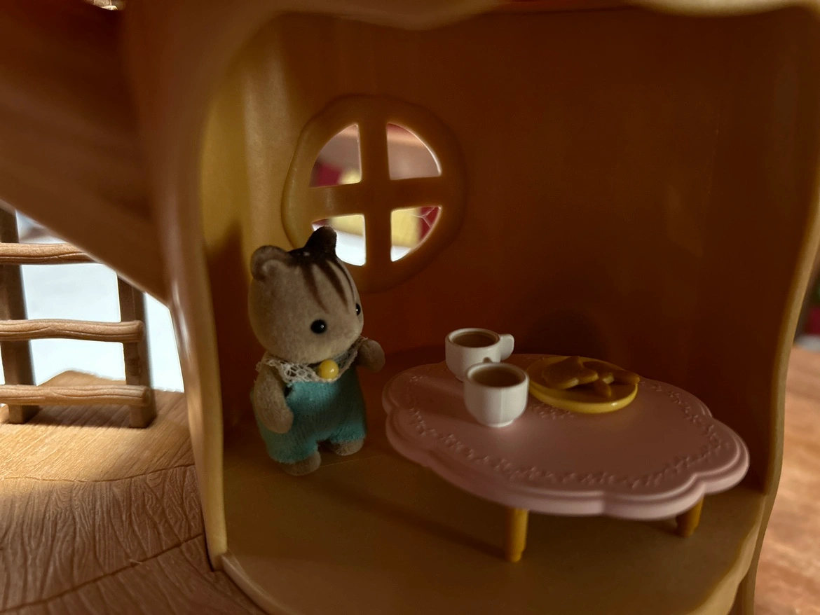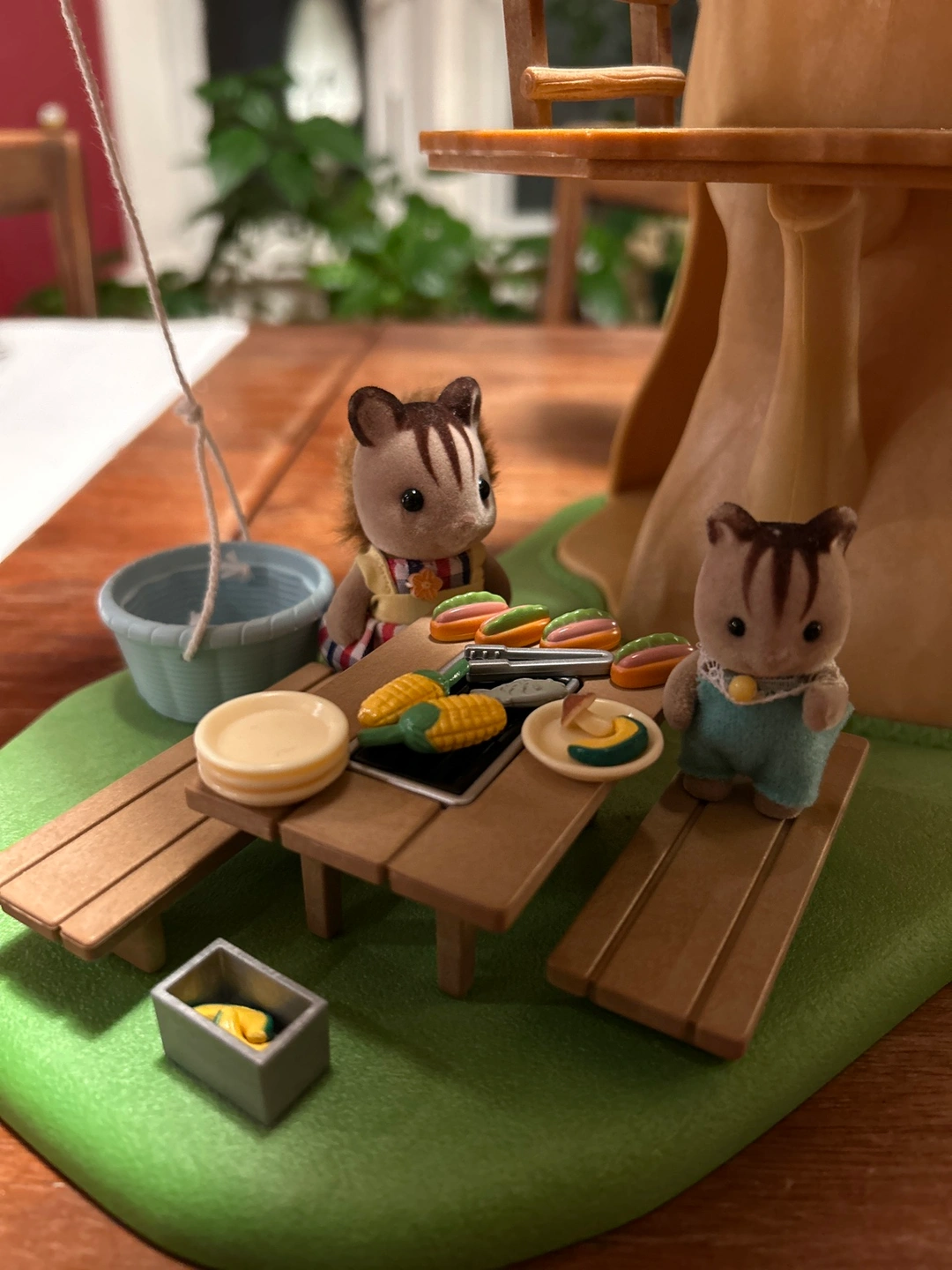 Treehouse playset with two levels, a slide, a picnic table, and a squirrel family (2). Includes all accessories pictured.