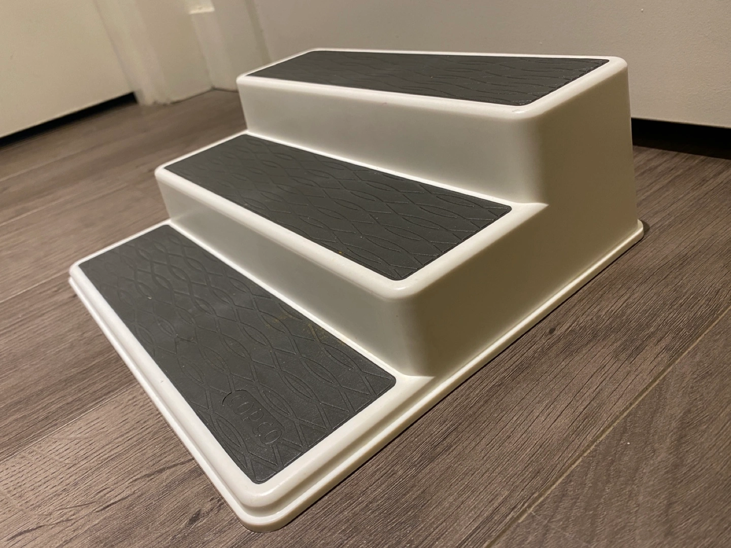 White plastic shelf with three tiers. Ideal for organizing small items in the kitchen, bathroom, or other rooms.
