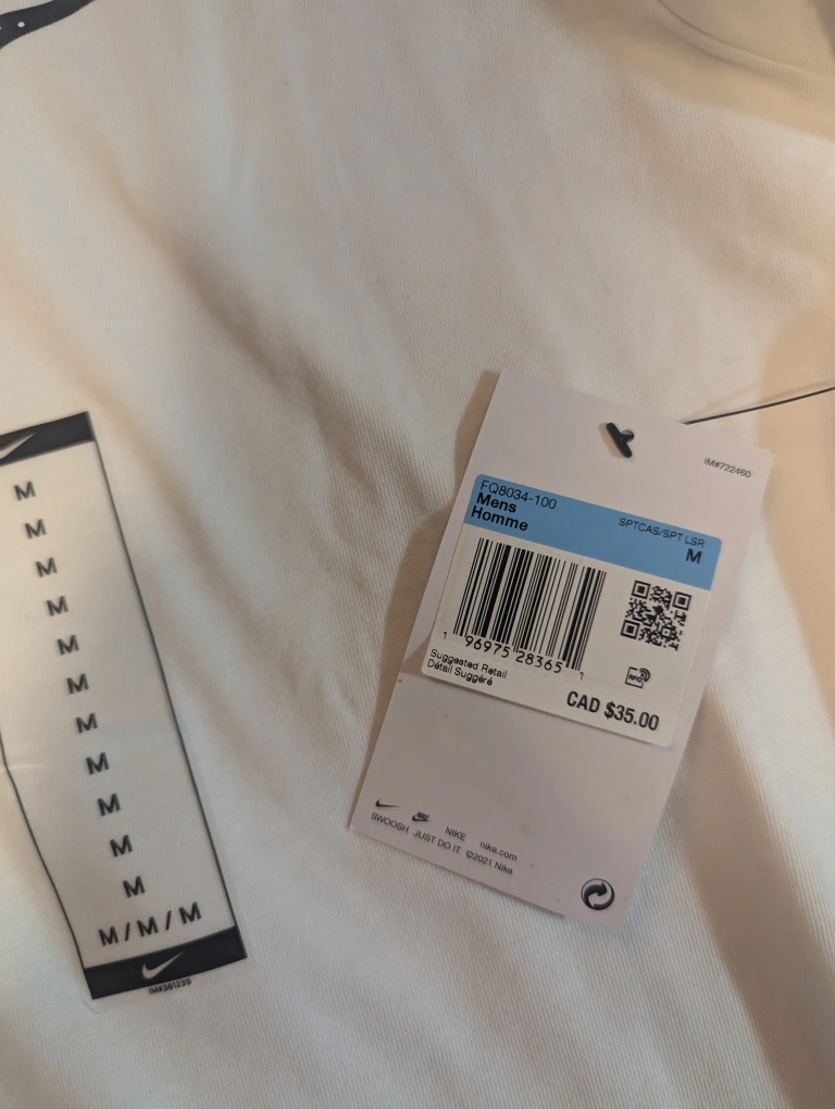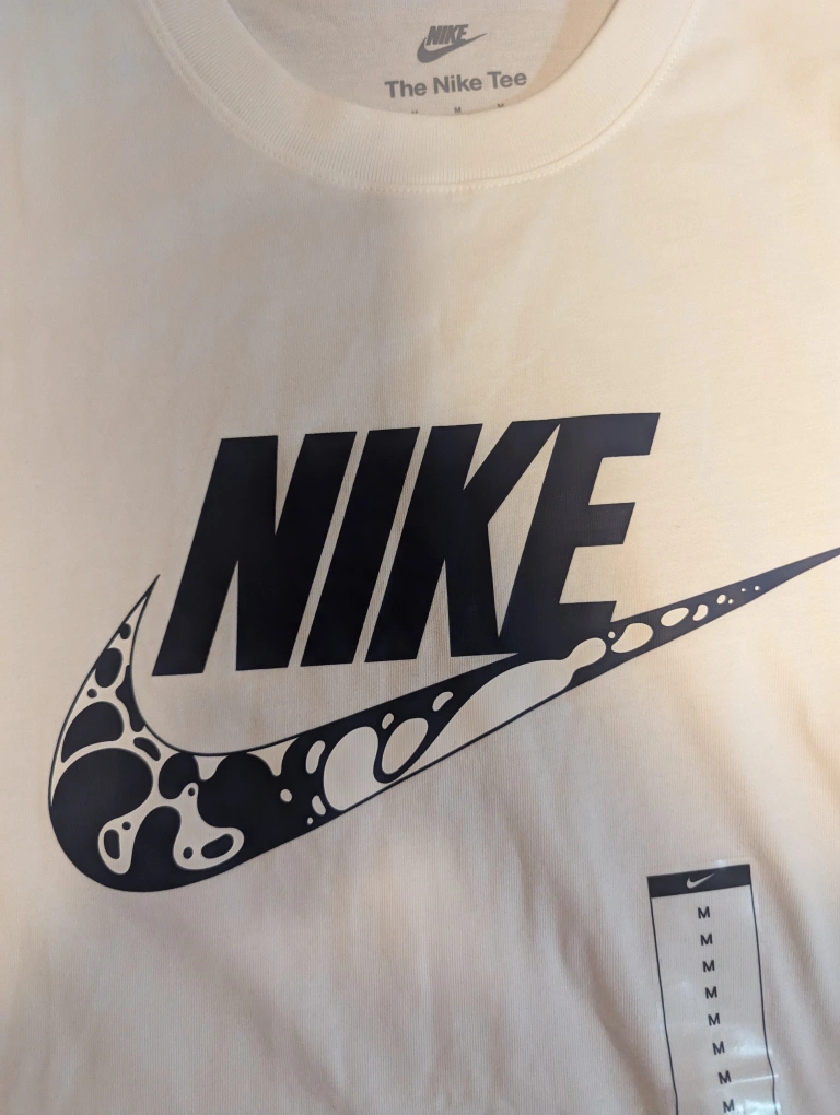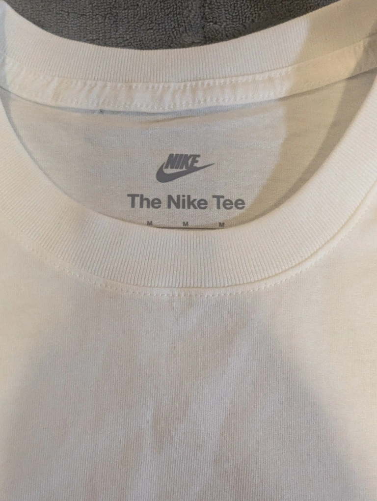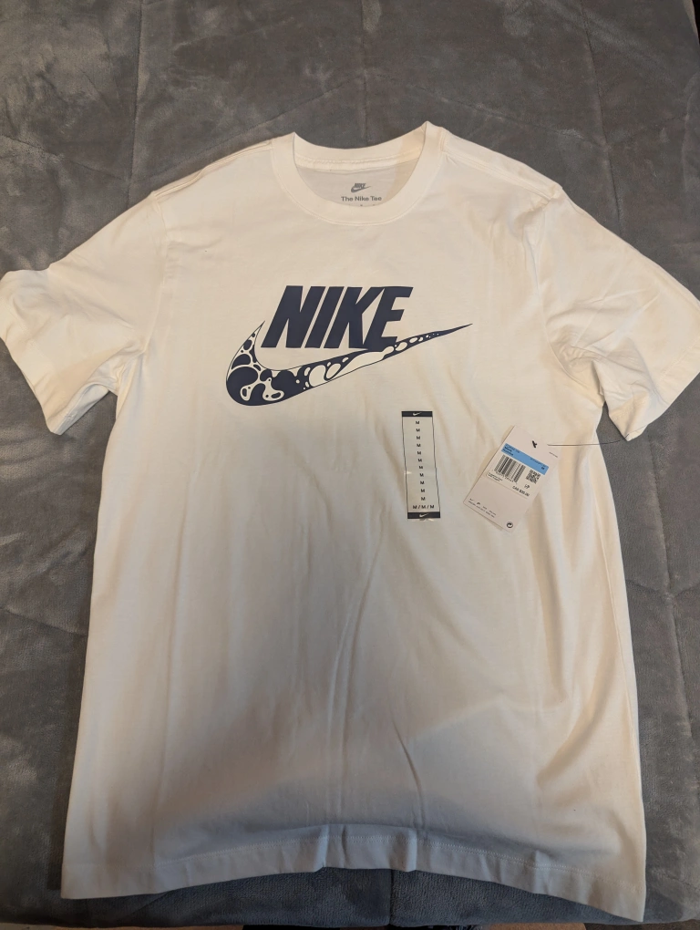 White t-shirt with a blue Nike logo. Short sleeves. Size M.