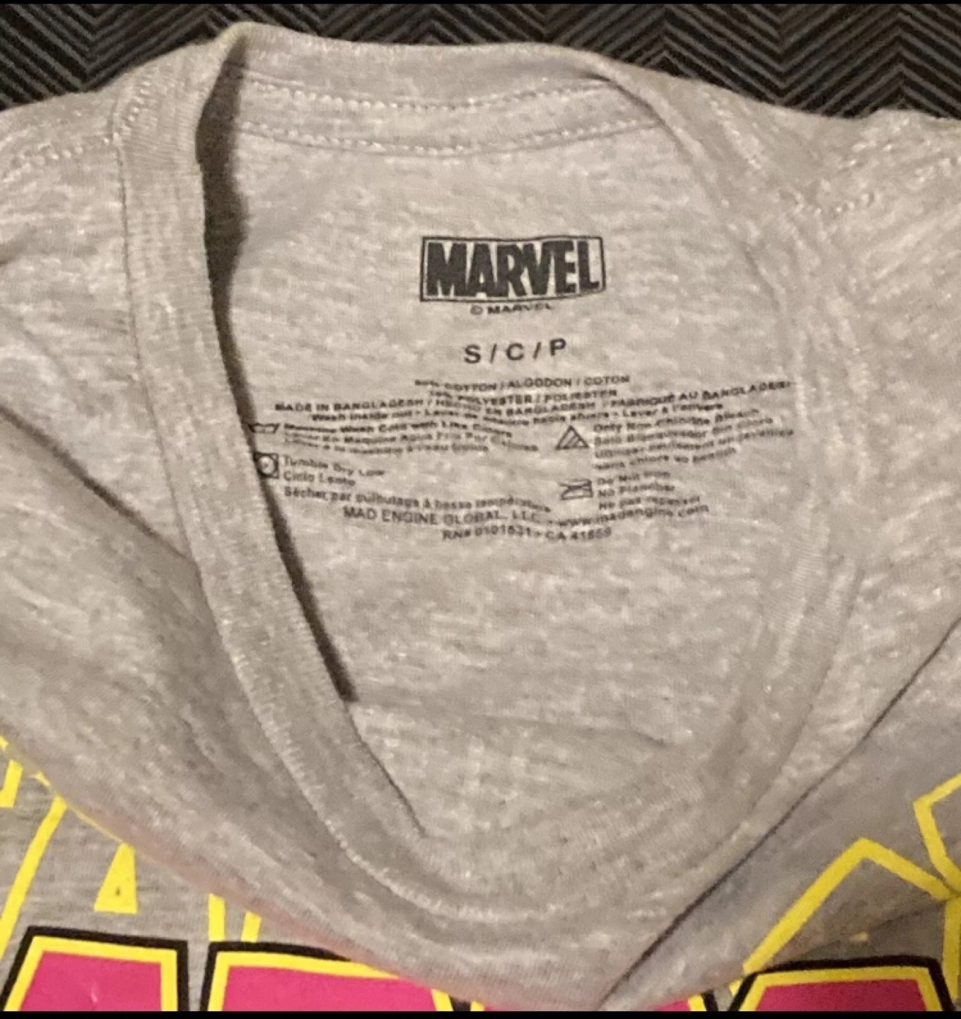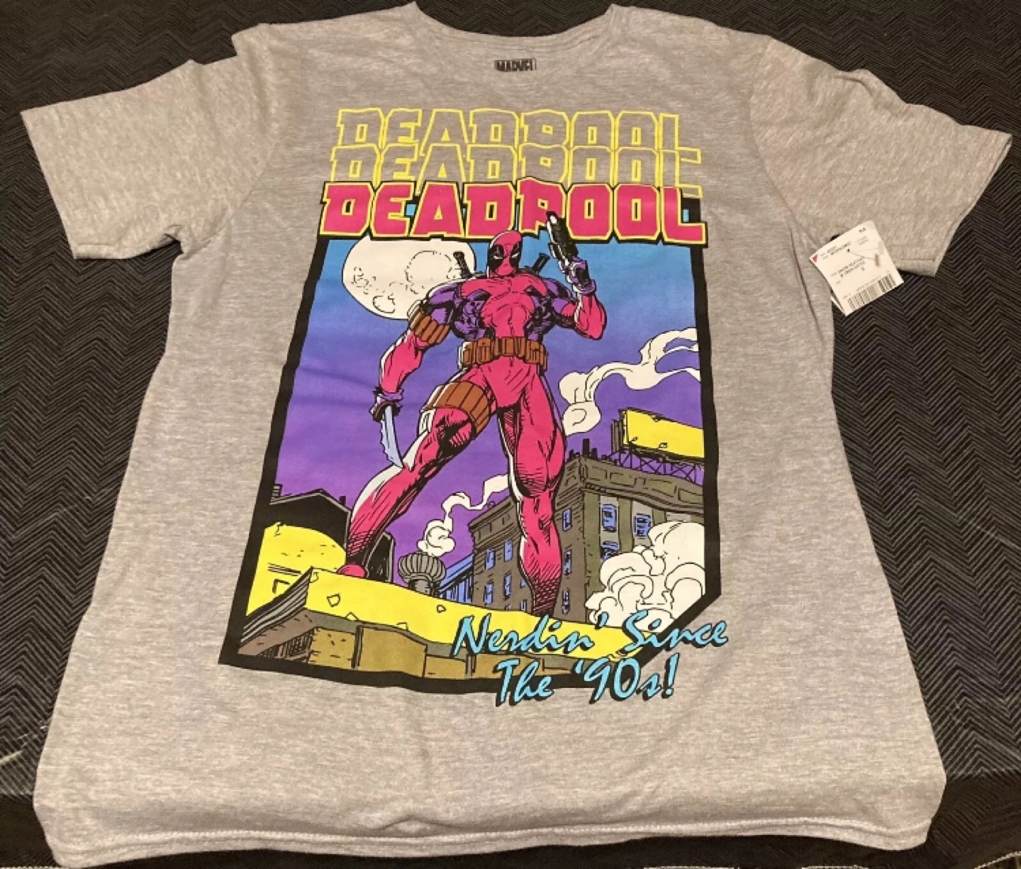 Grey short-sleeved t-shirt featuring a graphic of Deadpool standing on a rooftop. Graphic says 'Nerding since the 90s!'