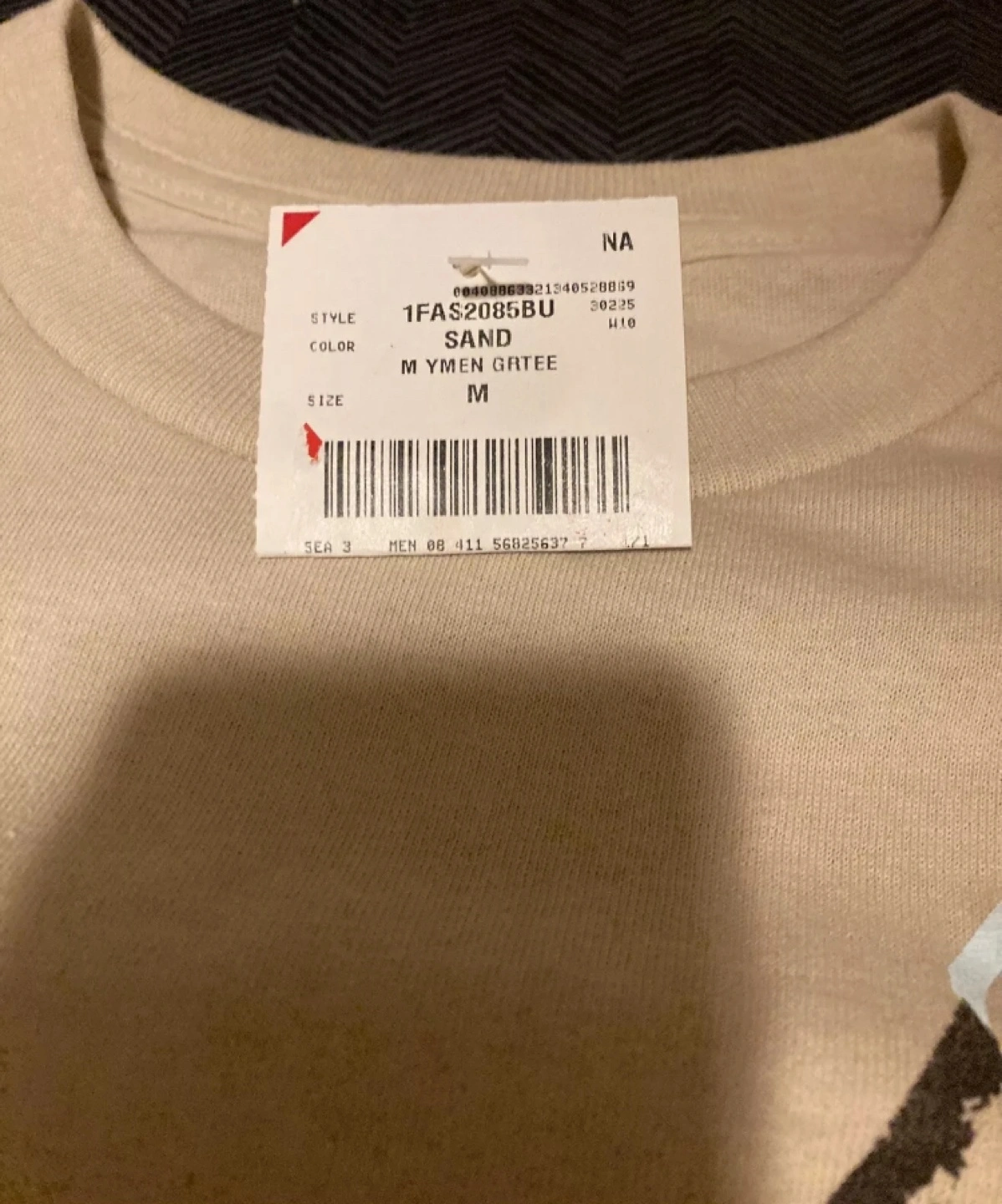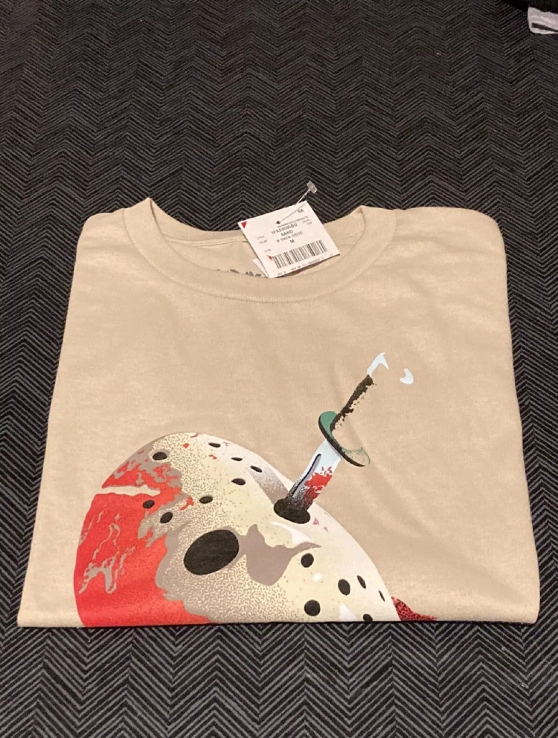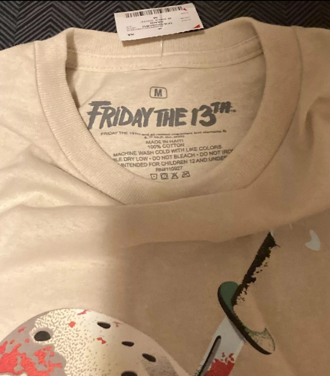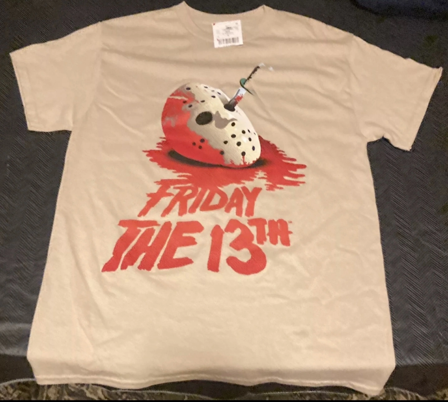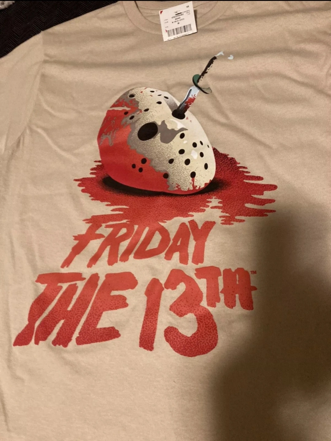 Tan T-Shirt with a graphic of Jason's mask with a knife through it and the words Friday the 13th in red lettering.