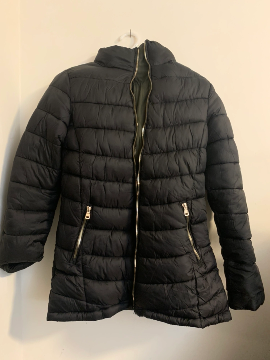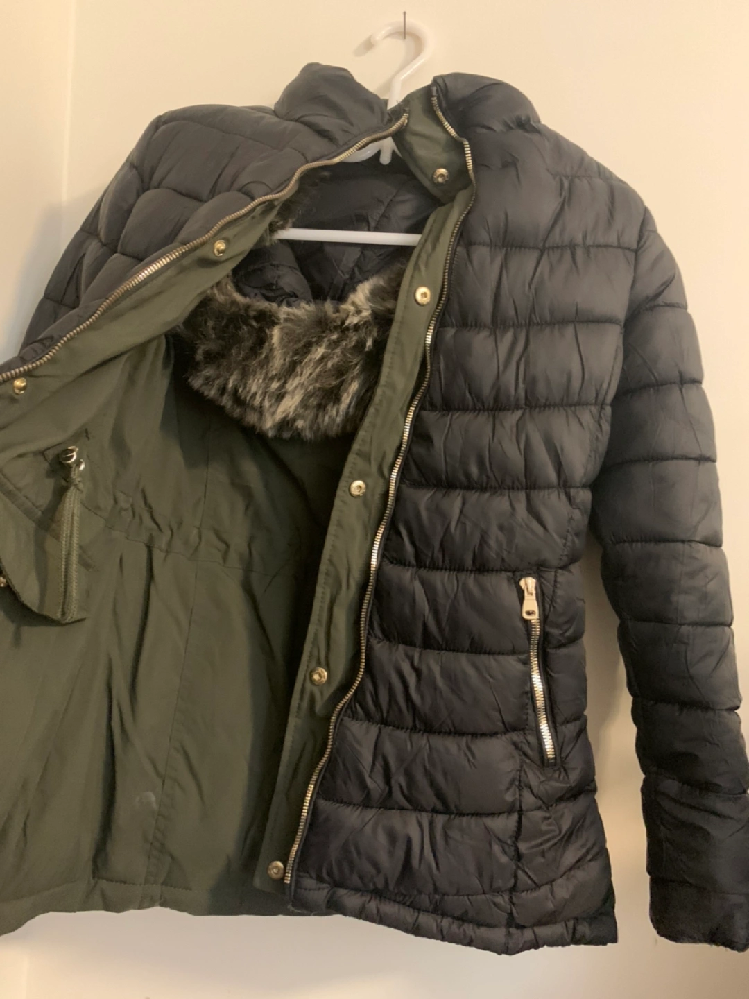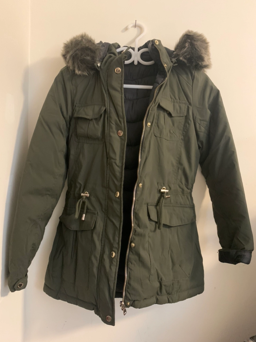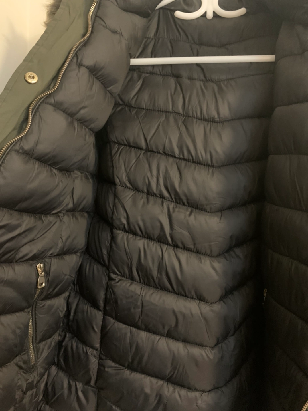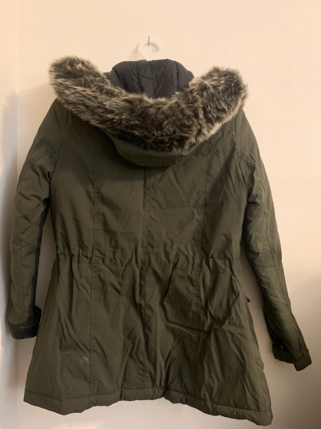 The coat is in very good condition. Been worn 2 times outside and kept in a pet free, smoke free home