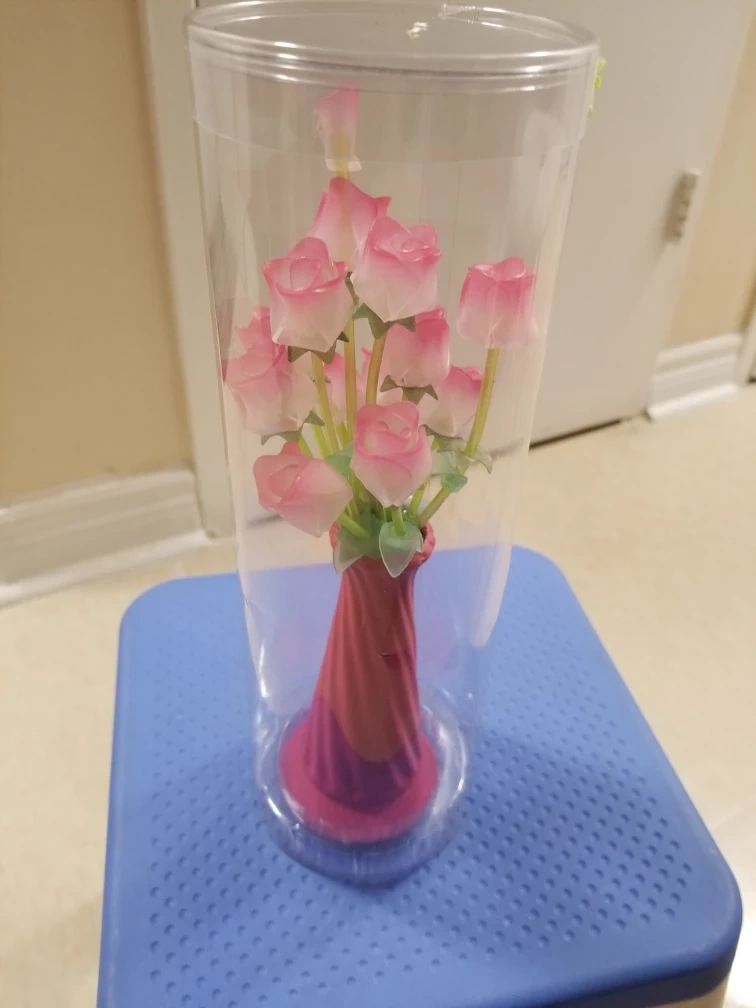 Artificial rose bouquet in a vase, enclosed in a clear plastic container. Pink roses with green stems.