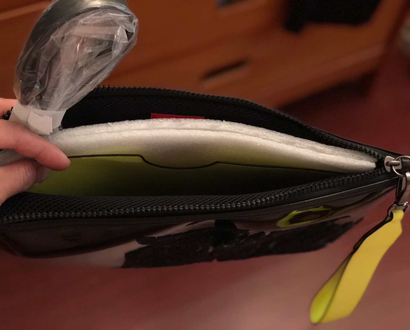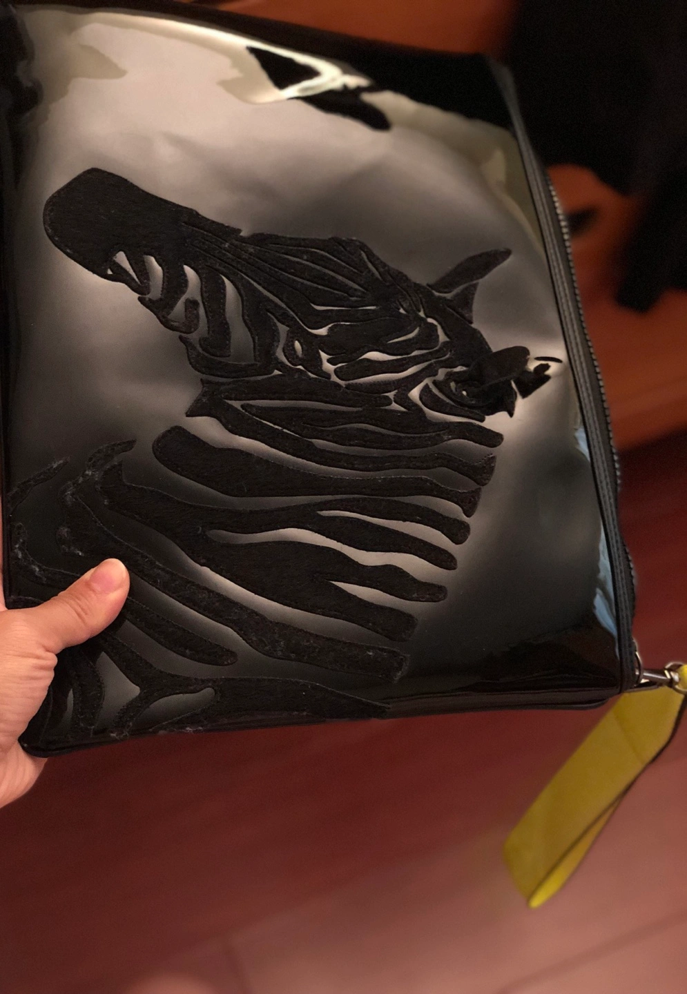 Brand new black clutch bag with a zebra design and a neon yellow strap.