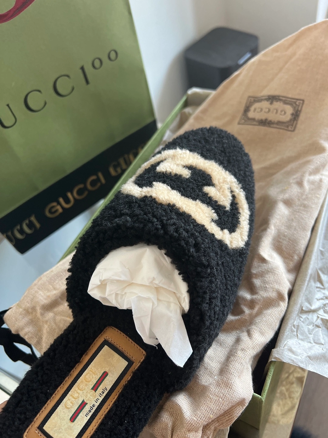 10Black shearling slippers with the signature GG logo. Comes with the original box and dust bag. Size 37.5.
