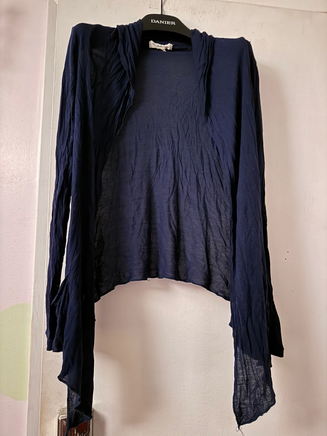 Long-sleeved cardigan with a draped neckline. Navy blue. Made of a light, stretchy fabric. Size M.