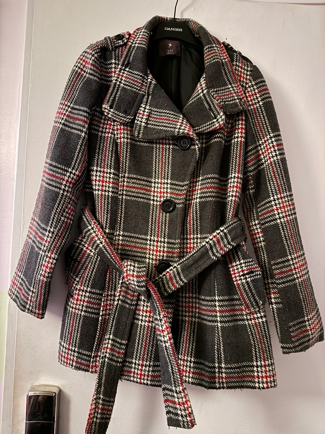 Women's plaid coat with a belt. Long sleeves and double breasted.