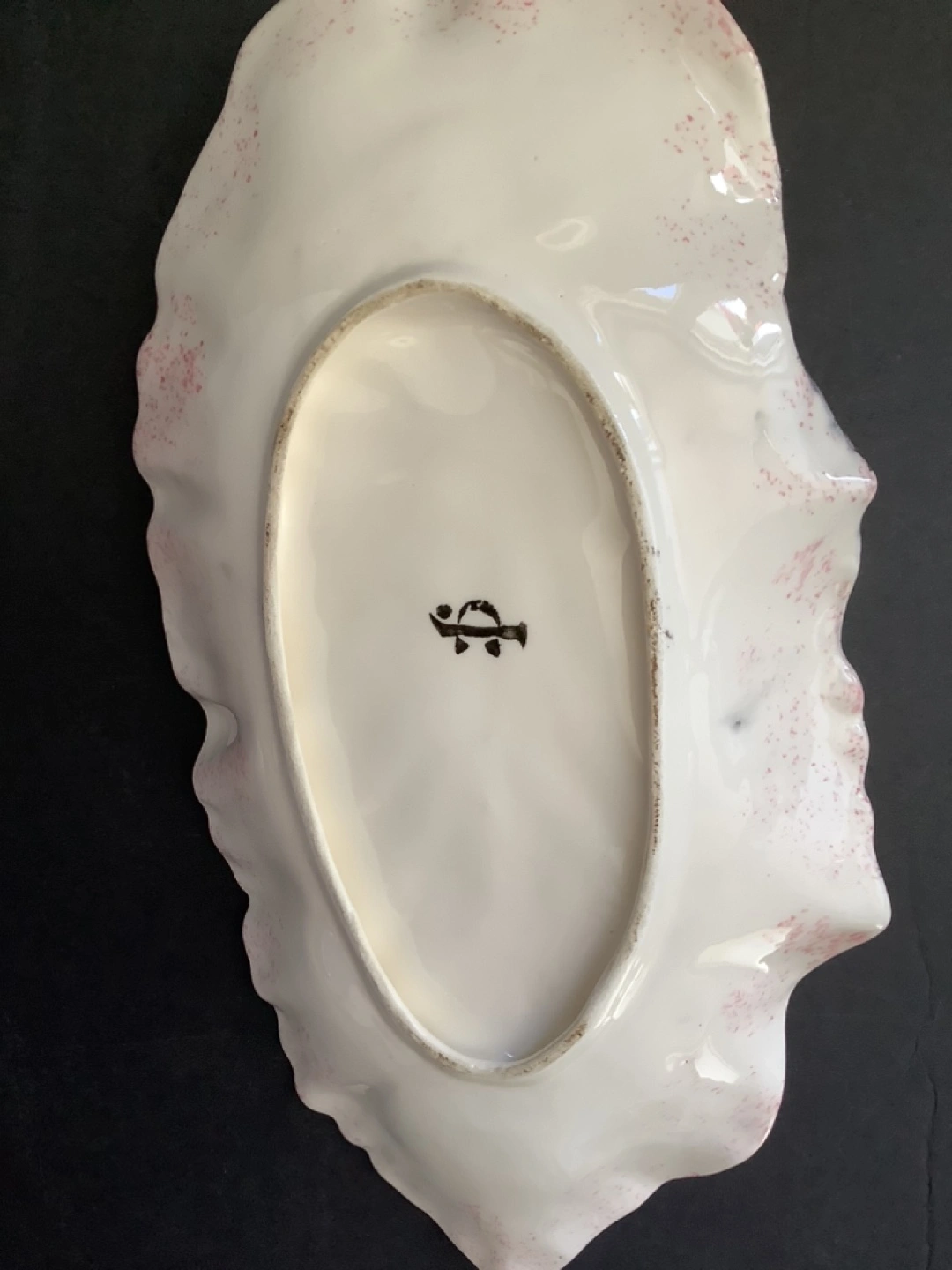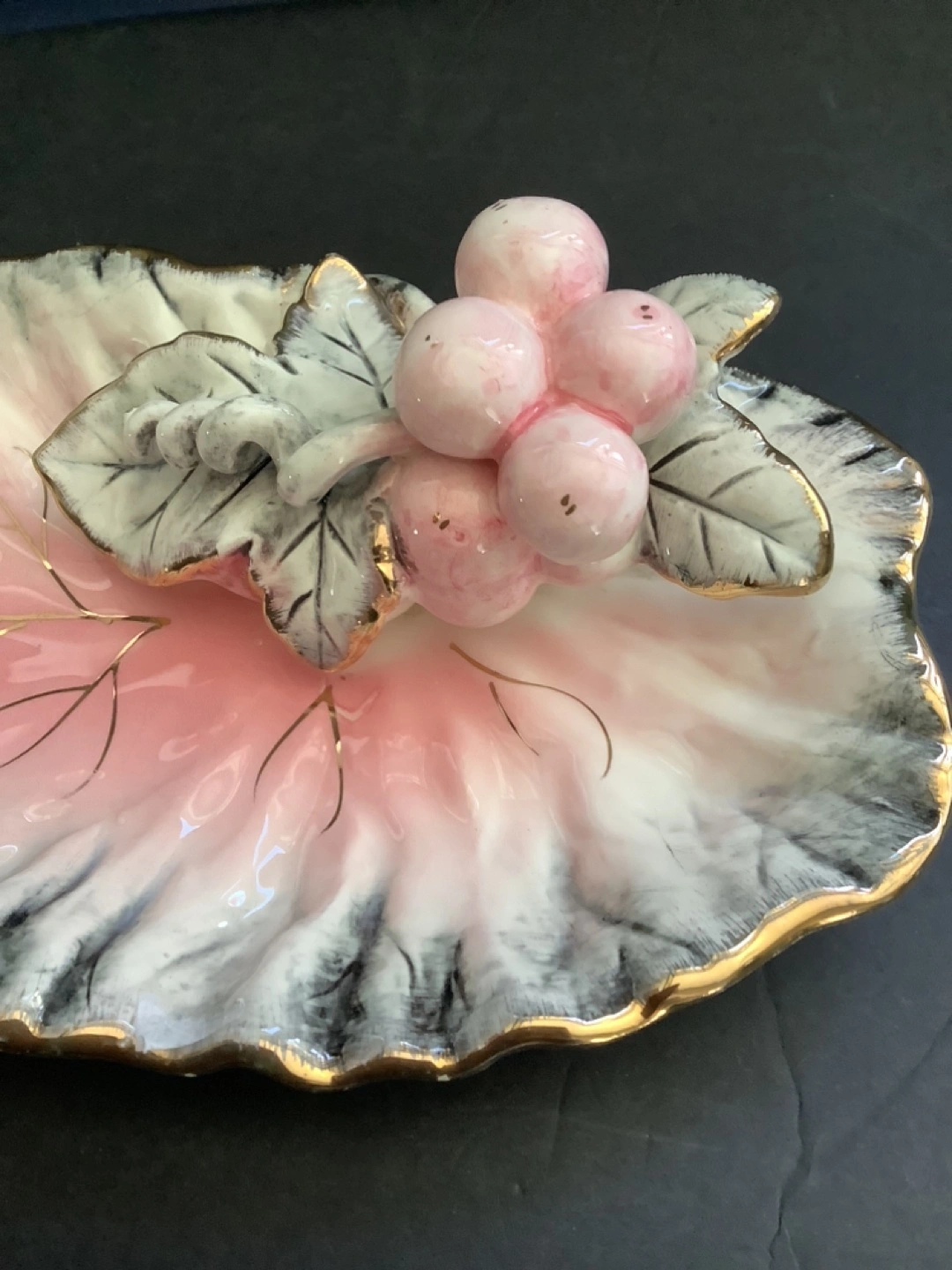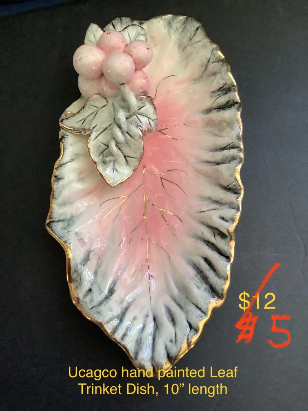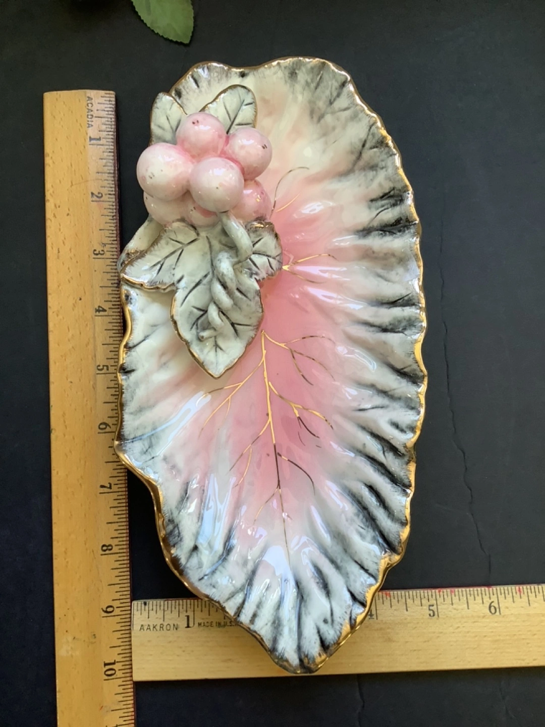 80Hand painted leaf shaped trinket dish with pink and gold accents. 10 inches long. In excellent condition.