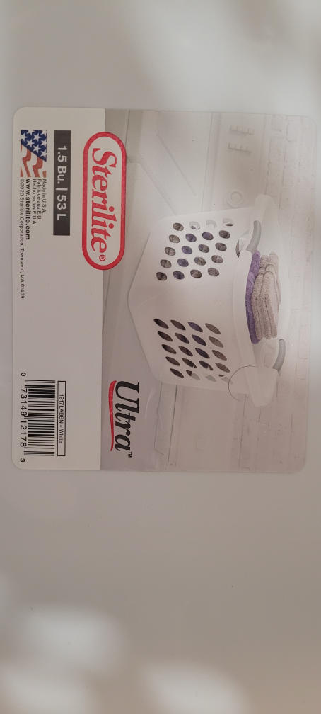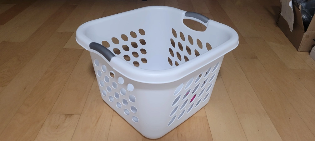 White laundry basket with grey handles. 15-gallon or 53 L capacity. Bonus included, a fluff picker ball.