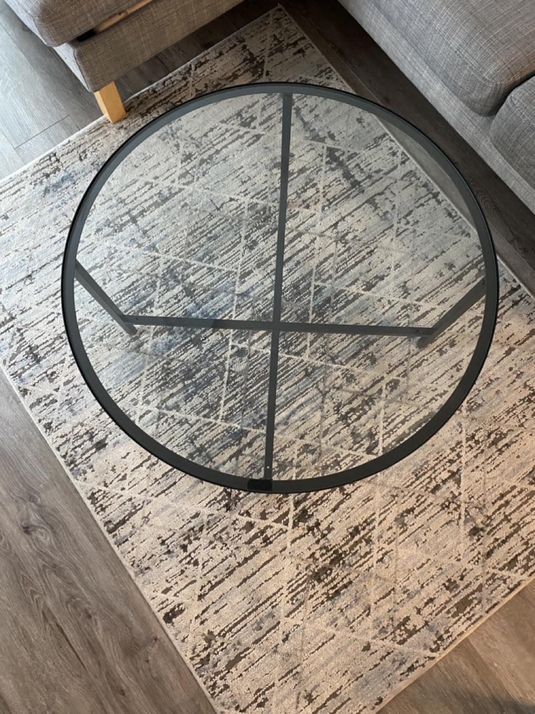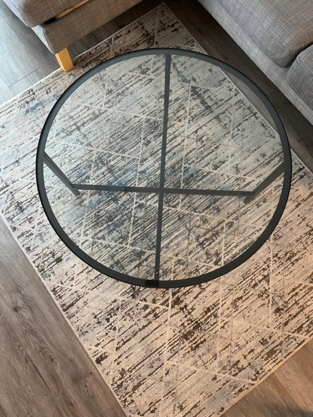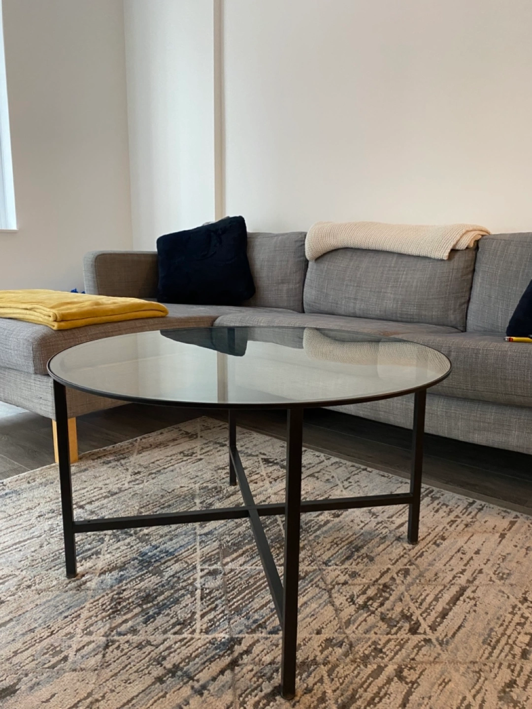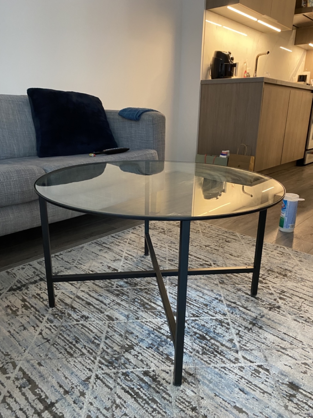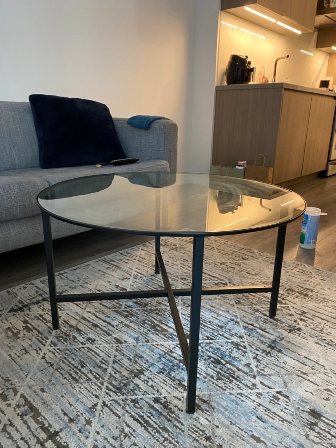 Round glass coffee table with black metal frame. Good condition.