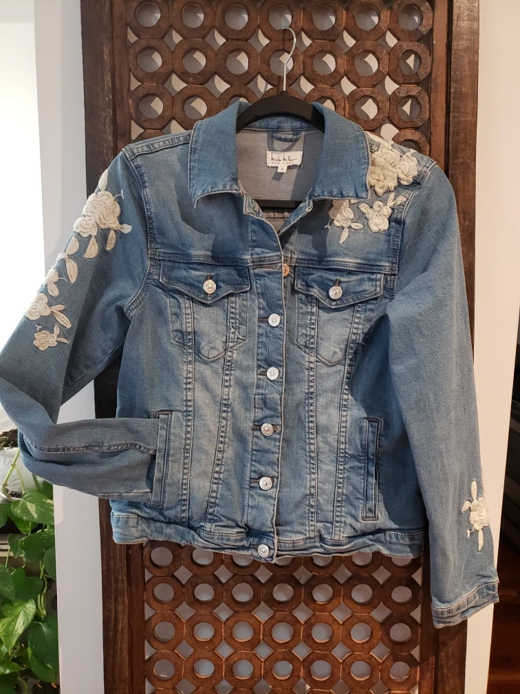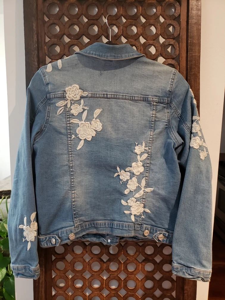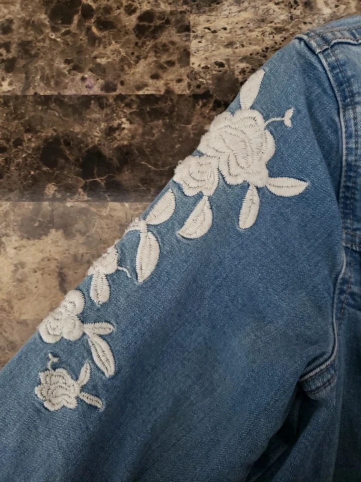 Light wash denim jacket with white floral embroidery on the back, shoulders, and sleeves.