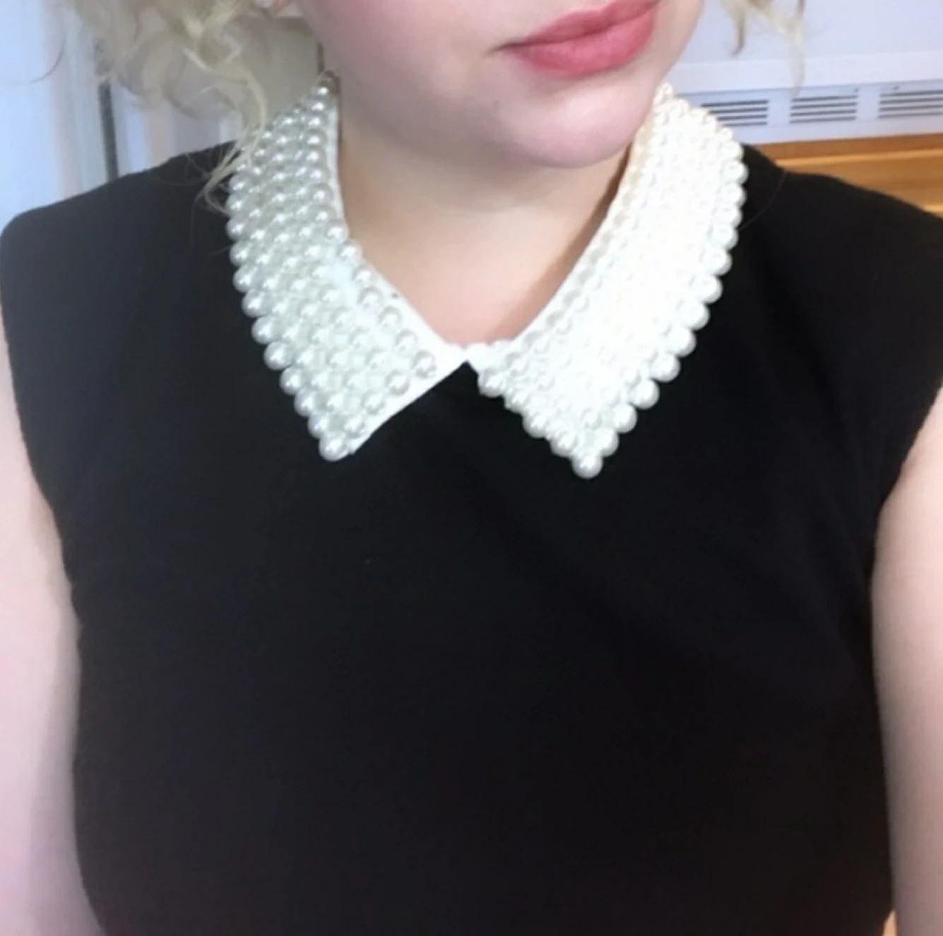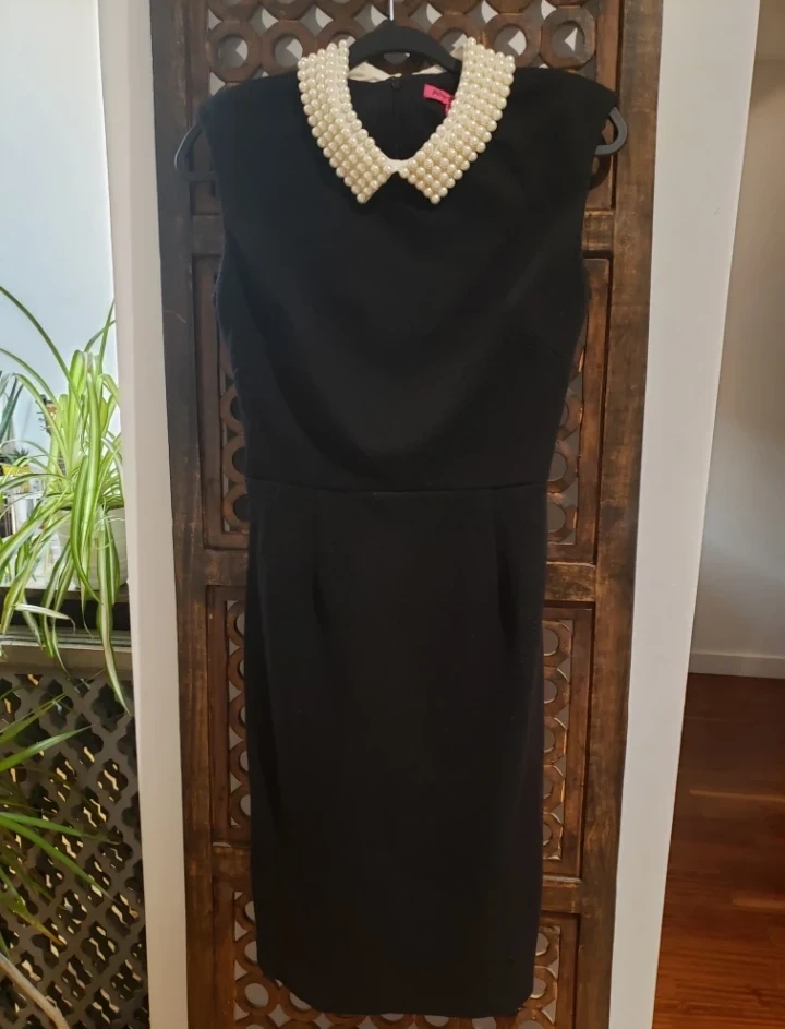 Sleeveless black dress with a large pearl collar. Classic and elegant. Purchased from Good Juicebox Vintage.