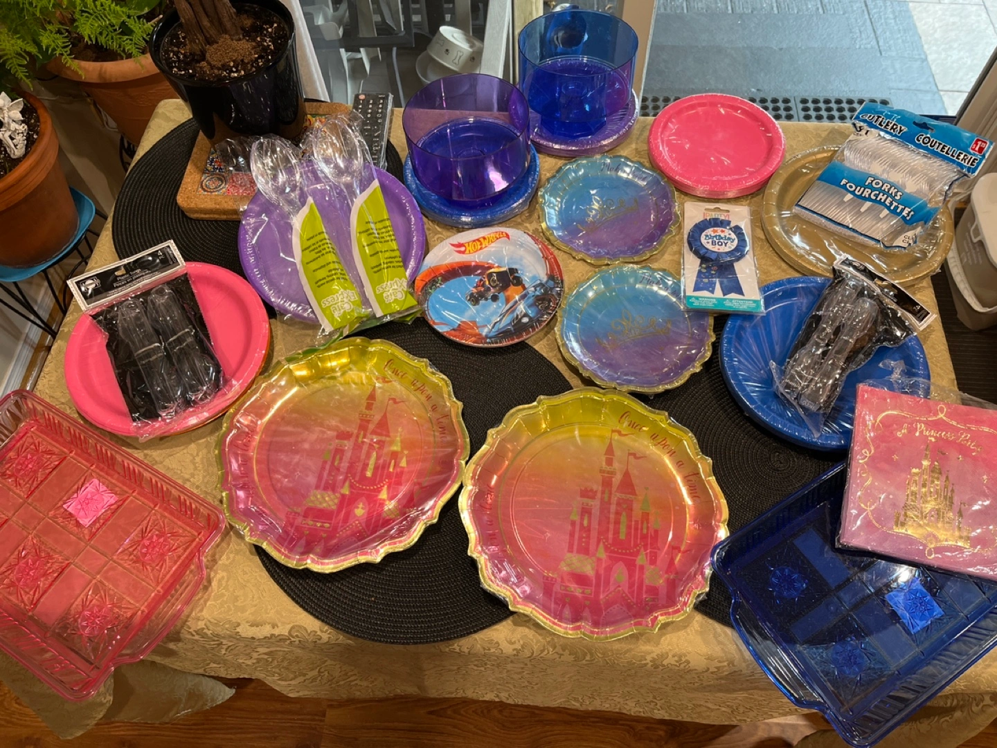 Set of Disney princess party plates and serving trays. Includes plates, serving trays cutlery snacks bowls and napkins tongs and birthday boy badge.