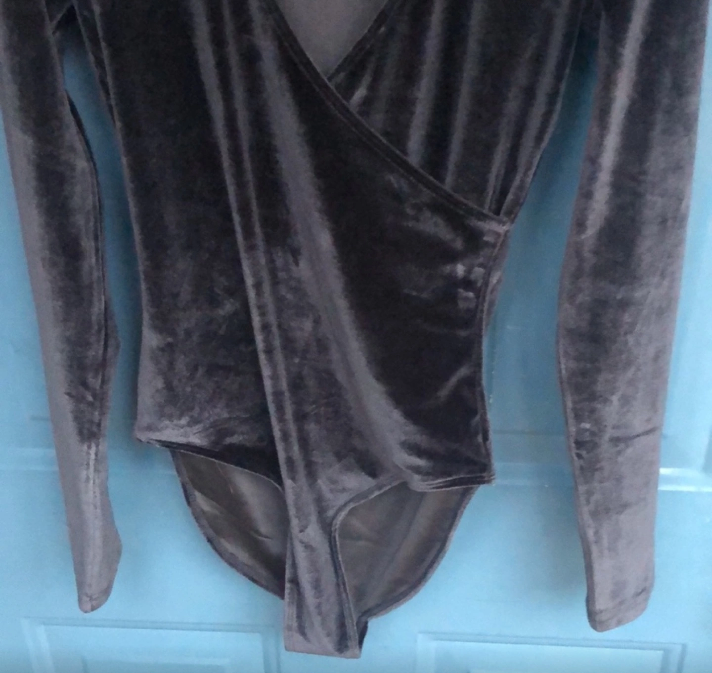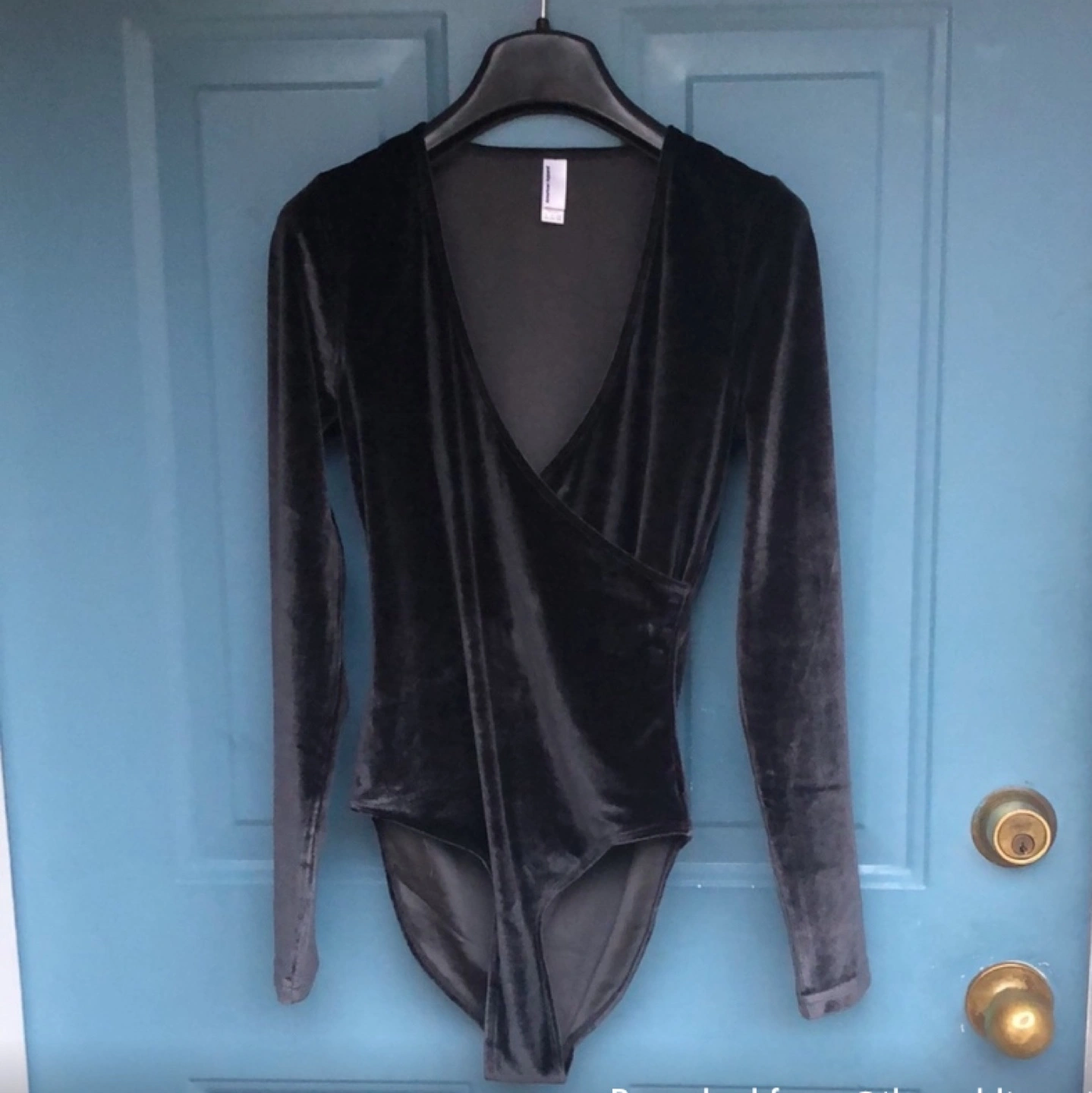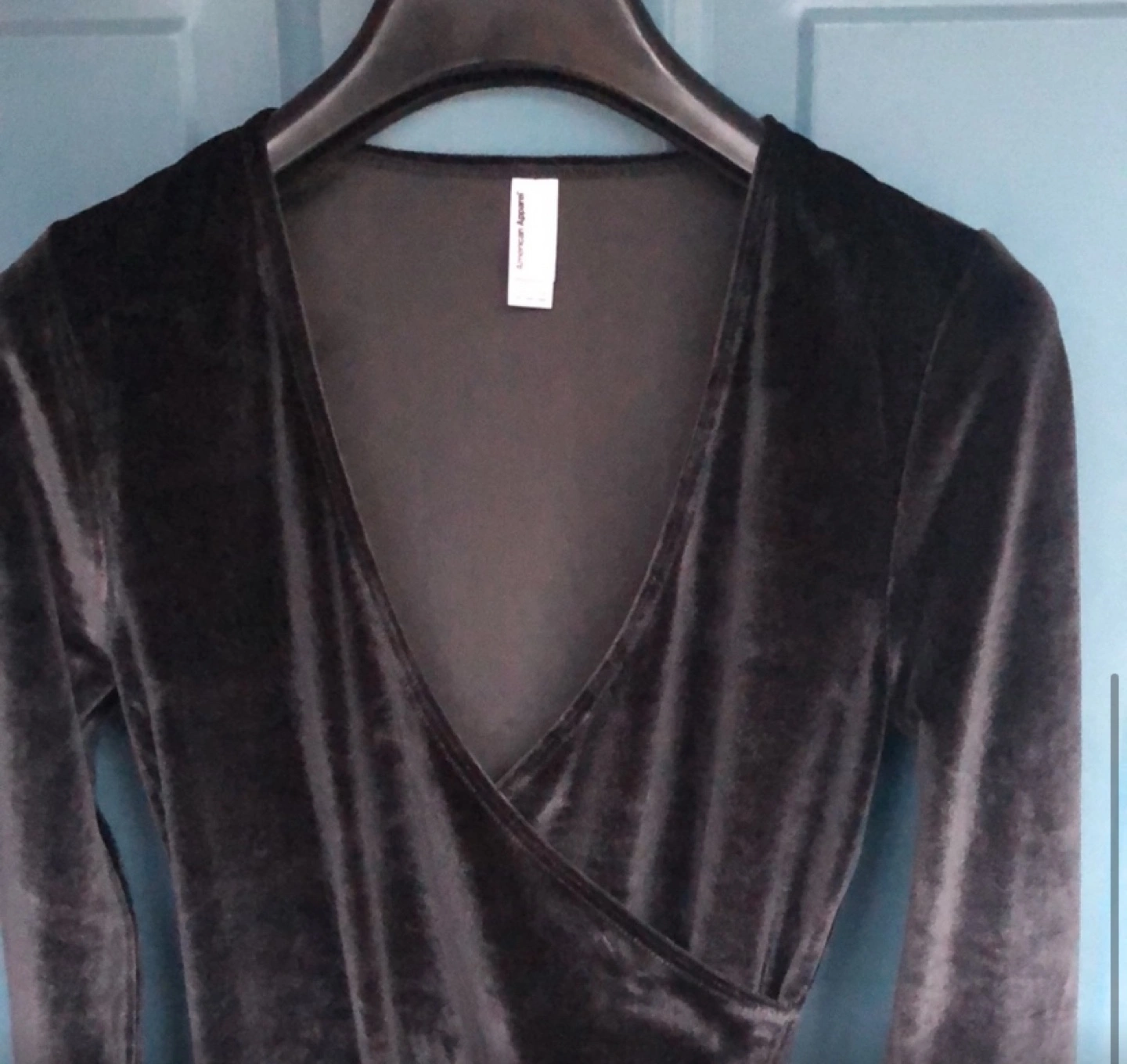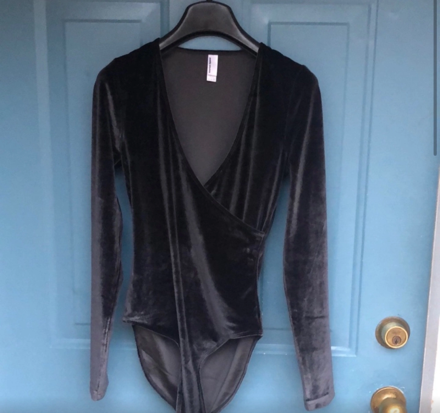Long sleeve bodysuit. V-neck, wrap style. Black velvet fabric. Like new - tried on and cut tags off before realizing it’s too small for me. There are no tags attached to this but I have included a photo of the tag for the info.