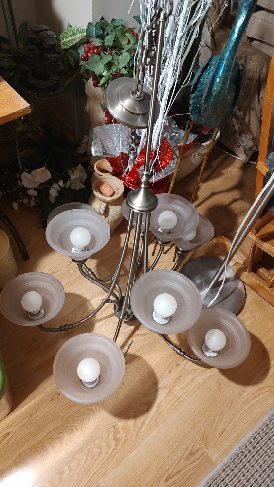 Chandelier with 6 frosted glass shades and silver finish. It has a chain to hang from the ceiling.