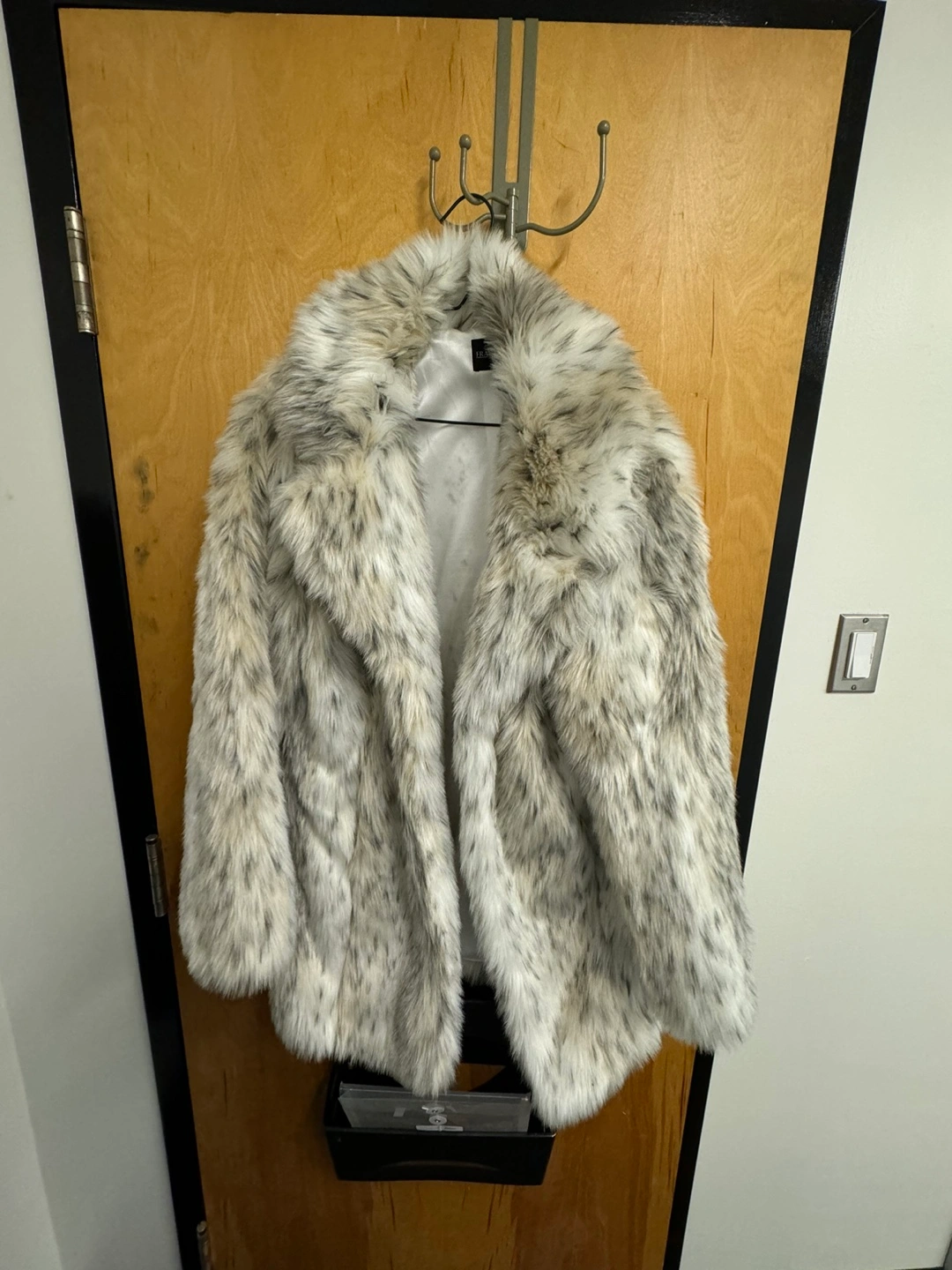 66Faux fur coat. White with grey spots. Size 14. Long sleeves. Collared. Keeps warm, small fit, great for season.