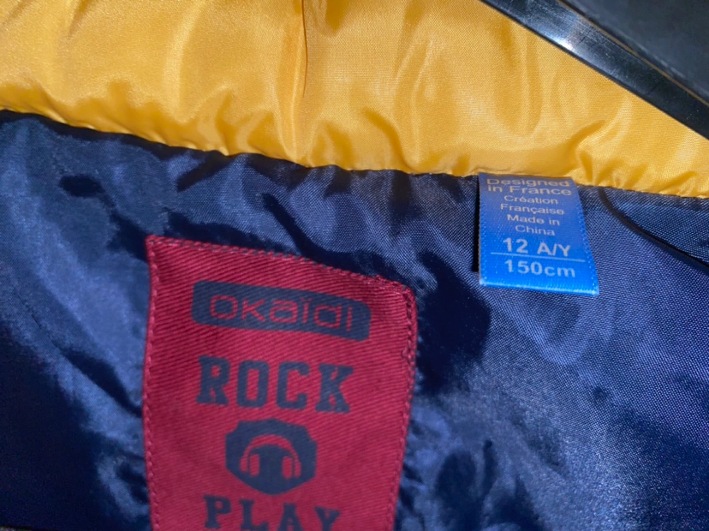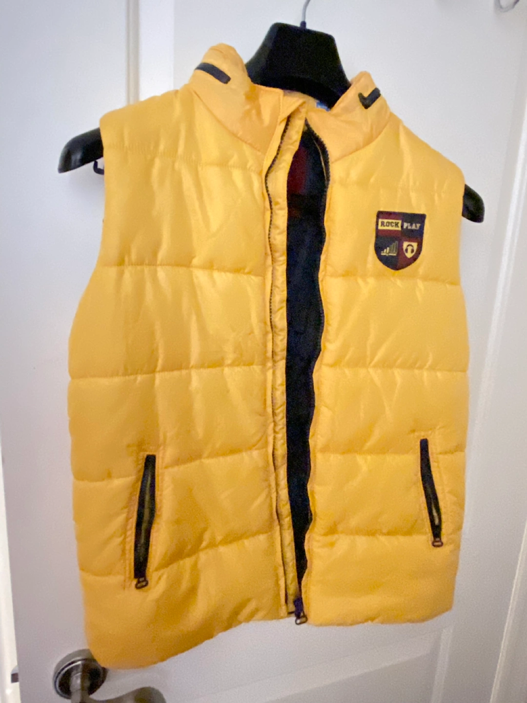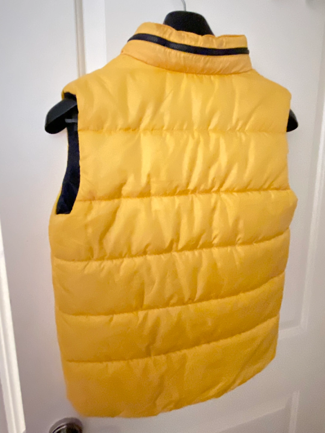 Boys puffer style vest size 12 by Okaidi Like new condition. Hardly ever worn. Colour yellow. With blue interior. rain hood in zippered collar