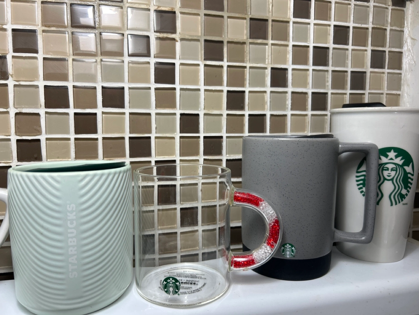 Set of Starbucks mugs and tumblers. Includes a ceramic mug with a cut-out design, a green patterned mug, a glass tumbler with a red handle, a grey mug, and a white ceramic tumbler with a lid. Some of them never used . Start from 10$