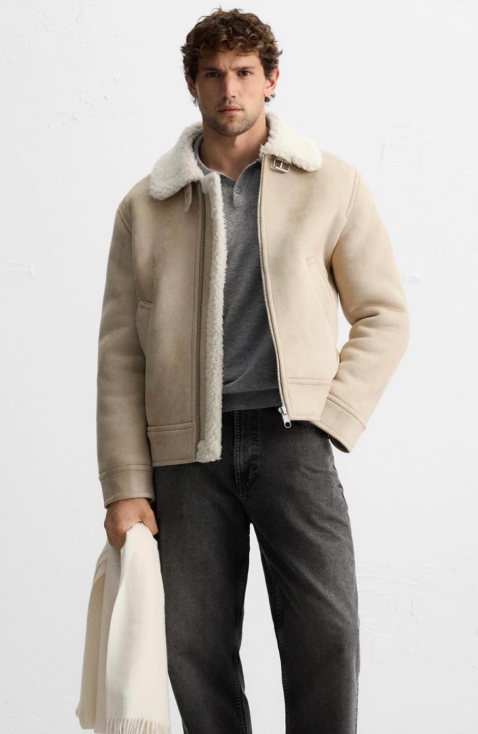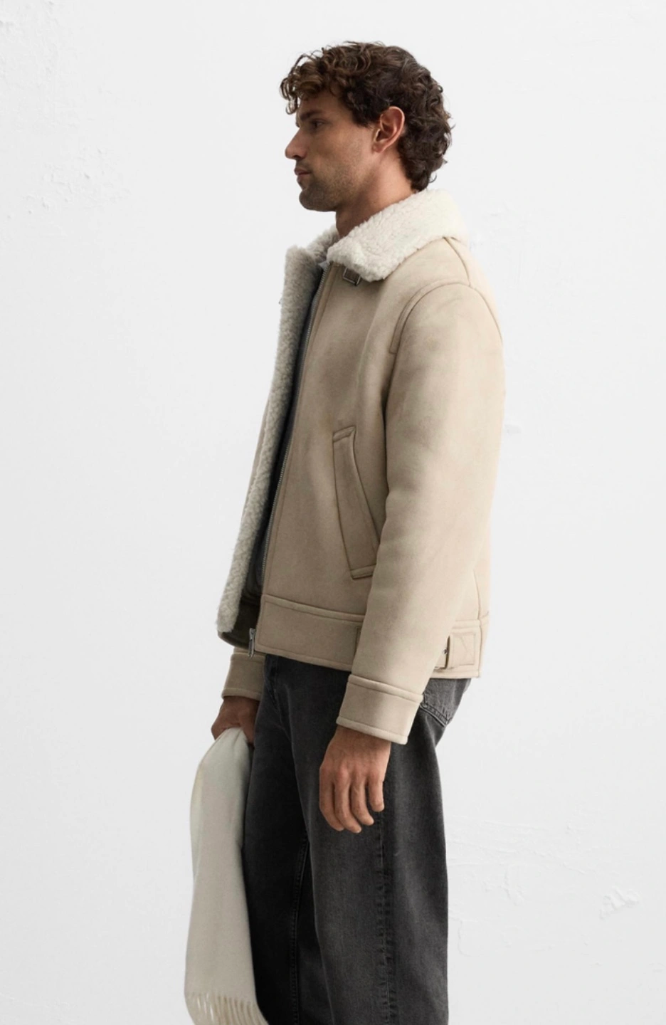 Regular fit jacket made of faux suede fabric with contrasting faux shearling interior. Lapel collar and long sleeves. Welt pockets at hip and interior pocket. Rib trim. Front zip closure.