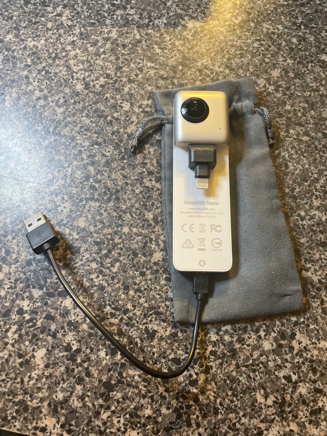 Insta360 Nano 360 degree camera. Includes charging cable, viewer/carrier box and carrying pouch. Also has an adapter for older iPhone that had a hard case. Comes with 32GB Micro SD card. Lenses are clean and free of scratches.