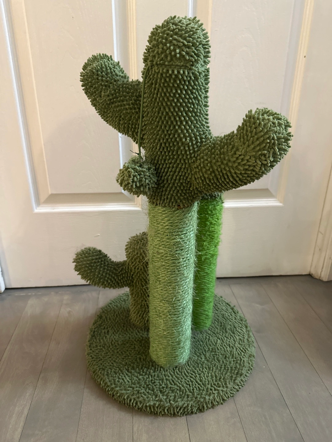 Green cat scratching post with 3 cactus-shaped posts. One post is covered in sisal rope.