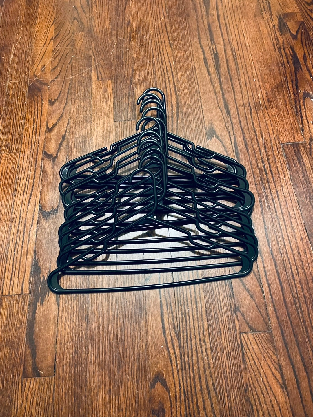 180Set of black plastic hangers, great for organizing your closet. Pick up near Dufferin Grove.