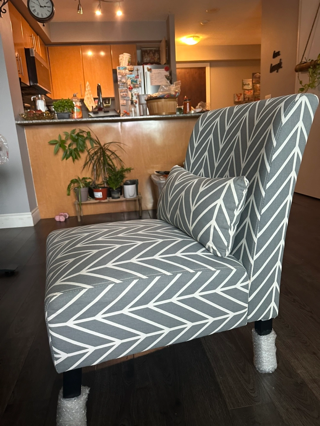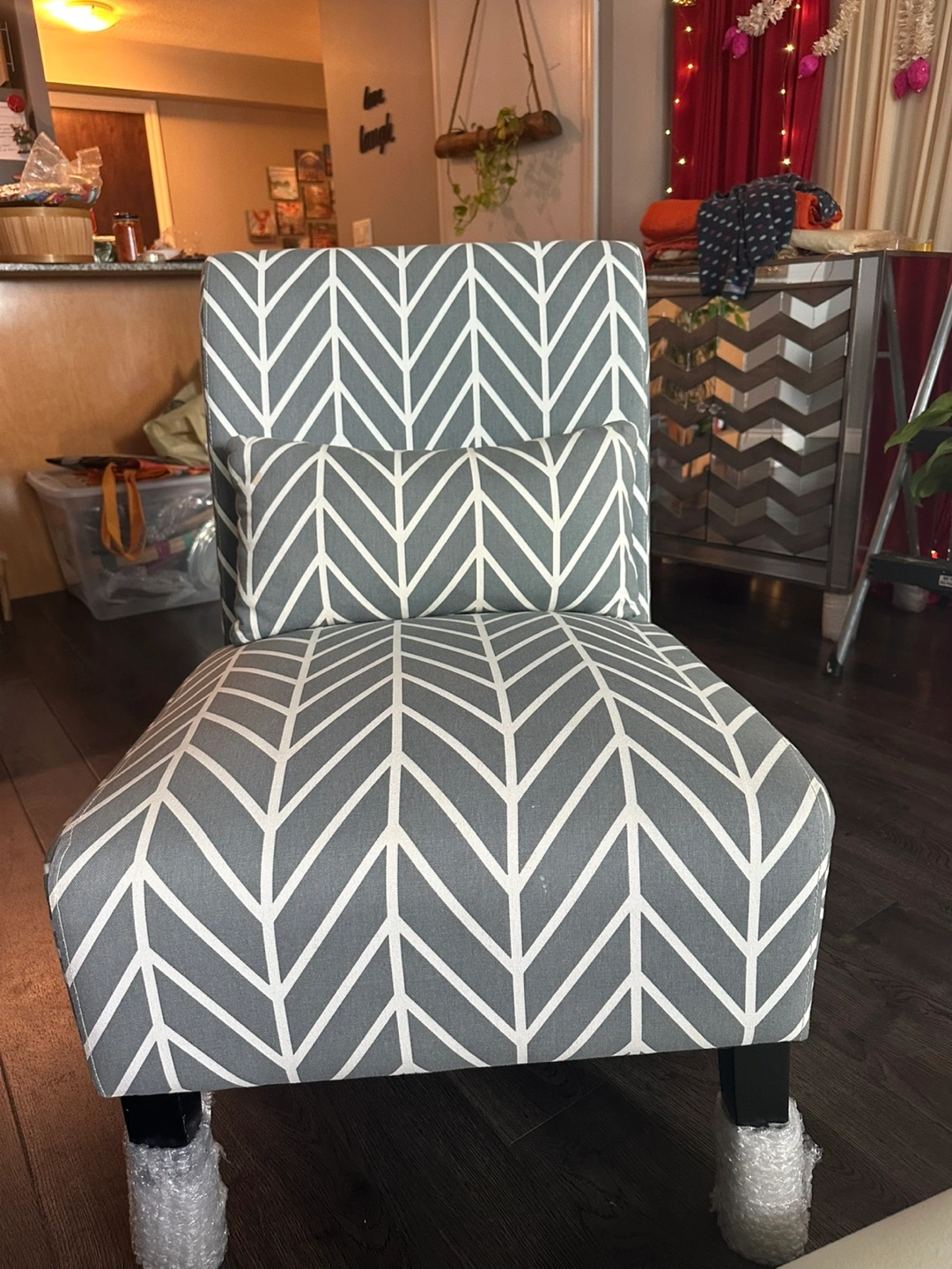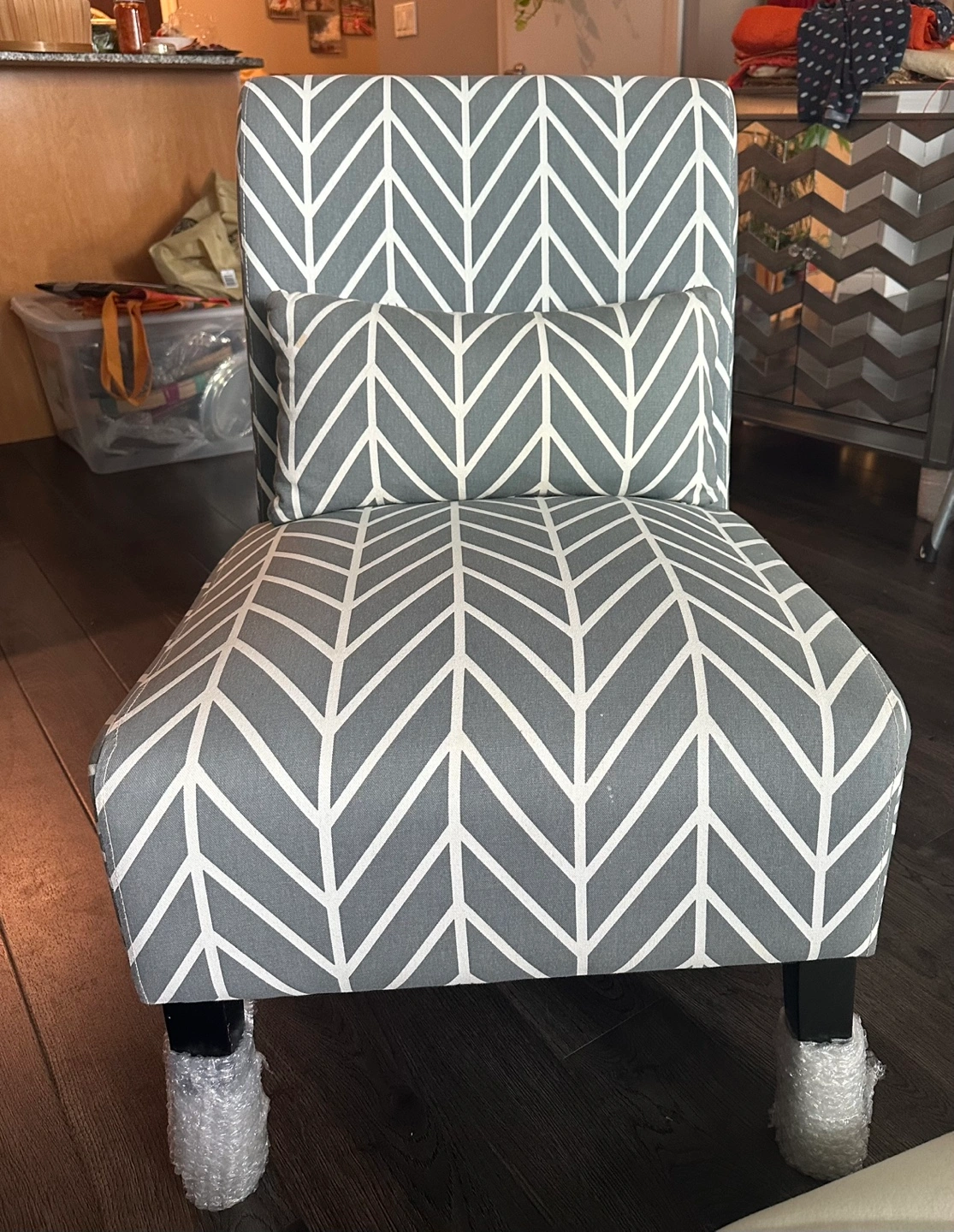 Grey and white accent chair with a chevron pattern. Includes matching lumbar pillow.