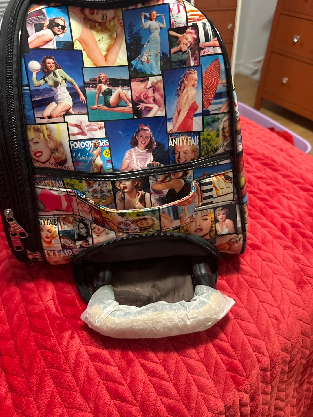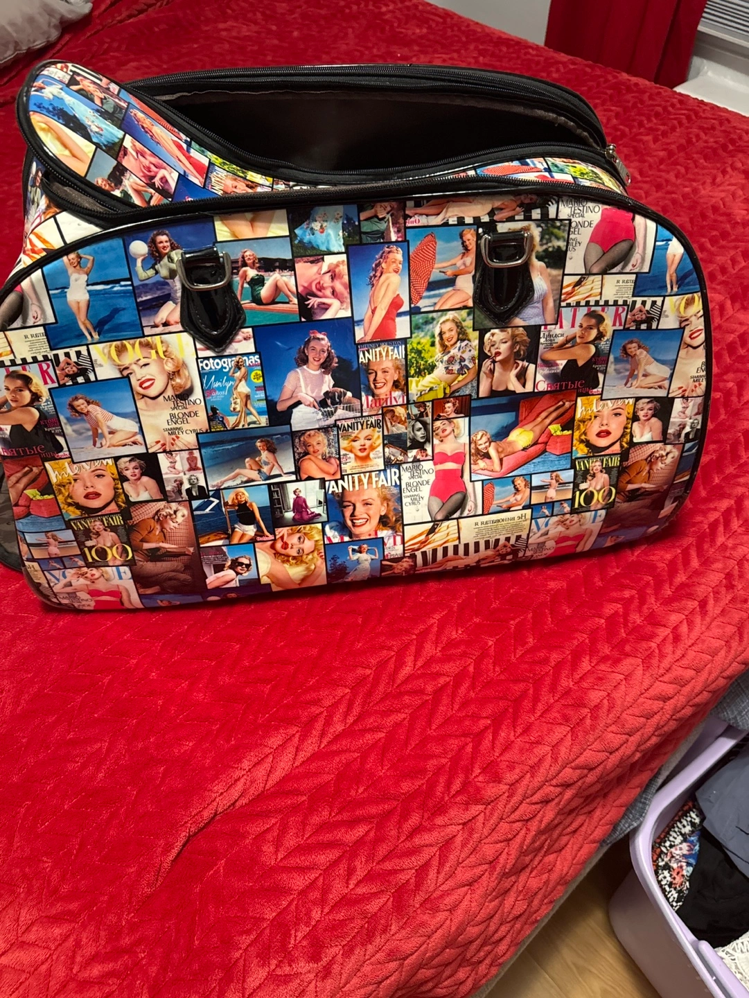 113Rolling suitcase with a black base and a colourful print of Vanity Fair magazine covers. Its missing the handles on the side but has a telescopic handle that extends for easier rolling.