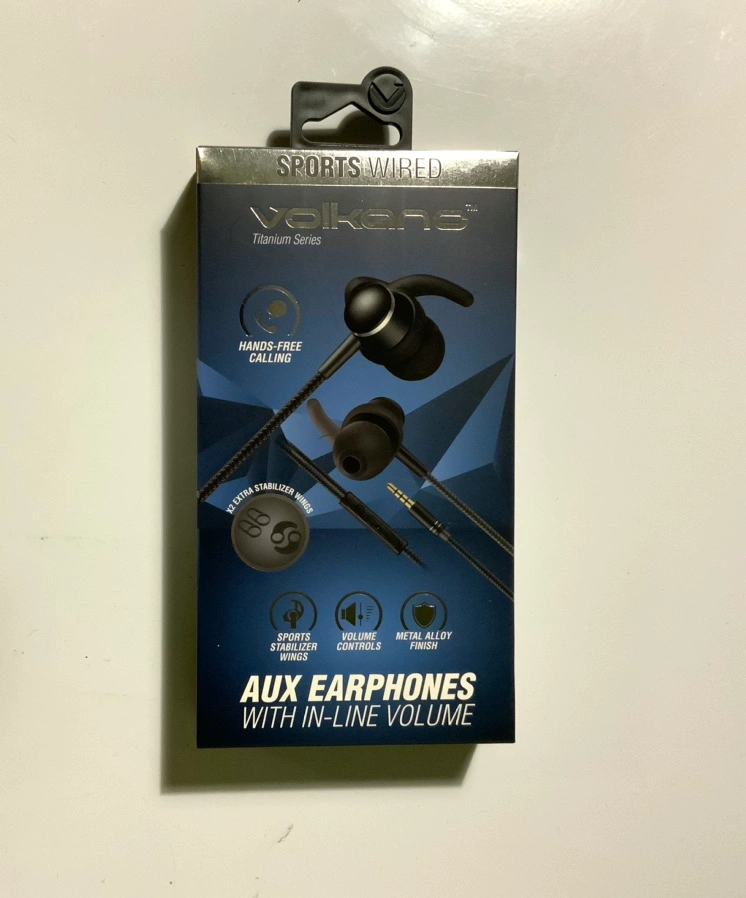 185Brand new in box Black sports aux earphones with in-line volume controls and metal alloy finish. Includes extra stabilizer wings.