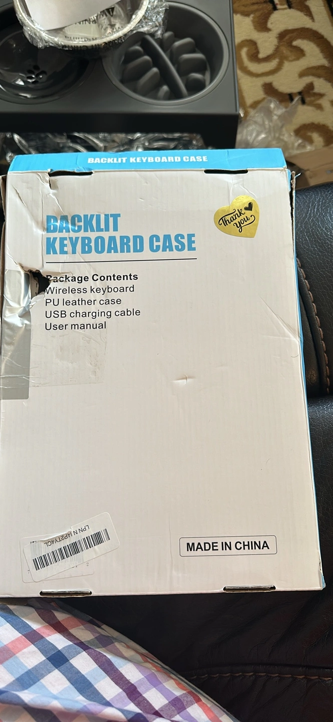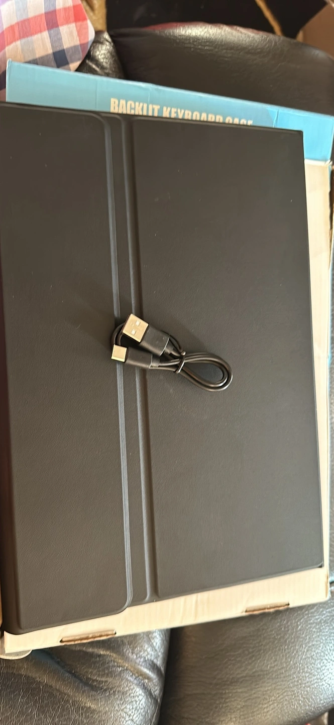 Black PU leather case with wireless keyboard and built-in touchpad. Includes a USB charging cable and user manual.