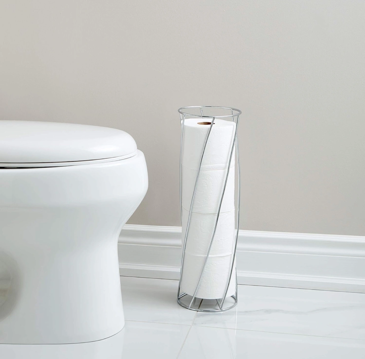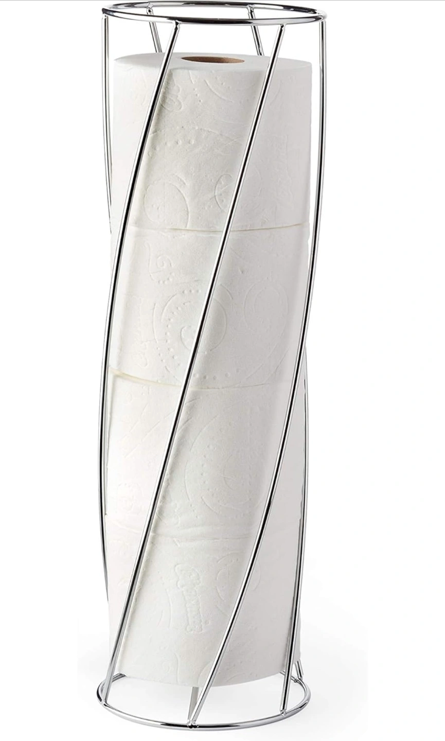 Chrome-plated stand with a sleek design. Holds multiple rolls of toilet paper.