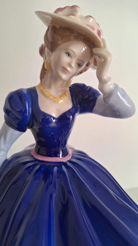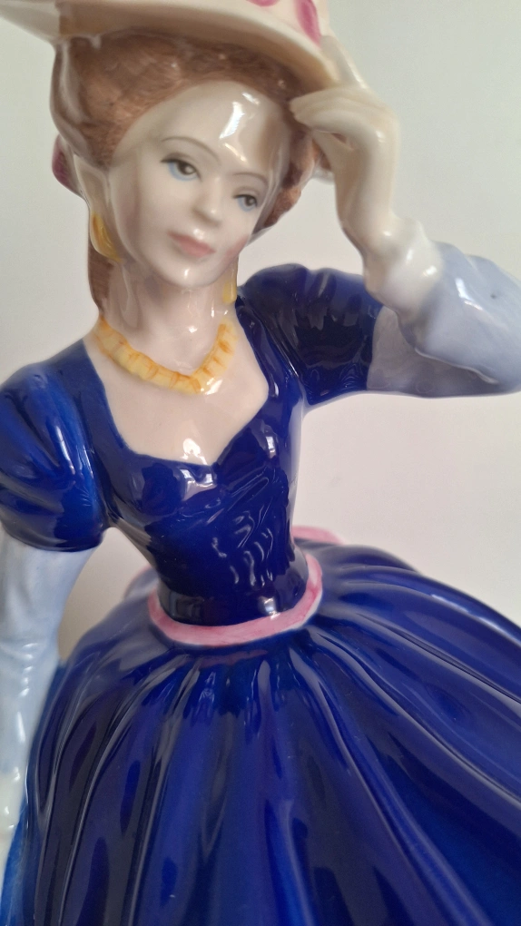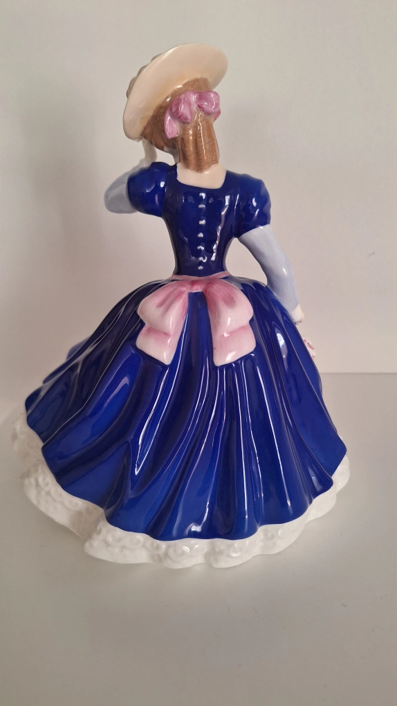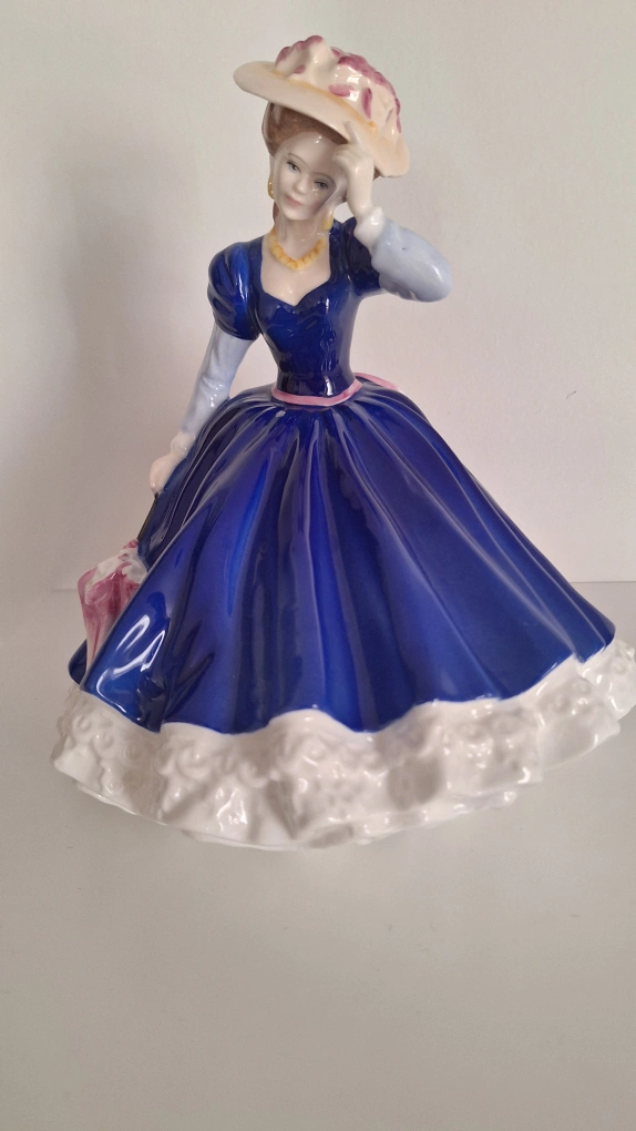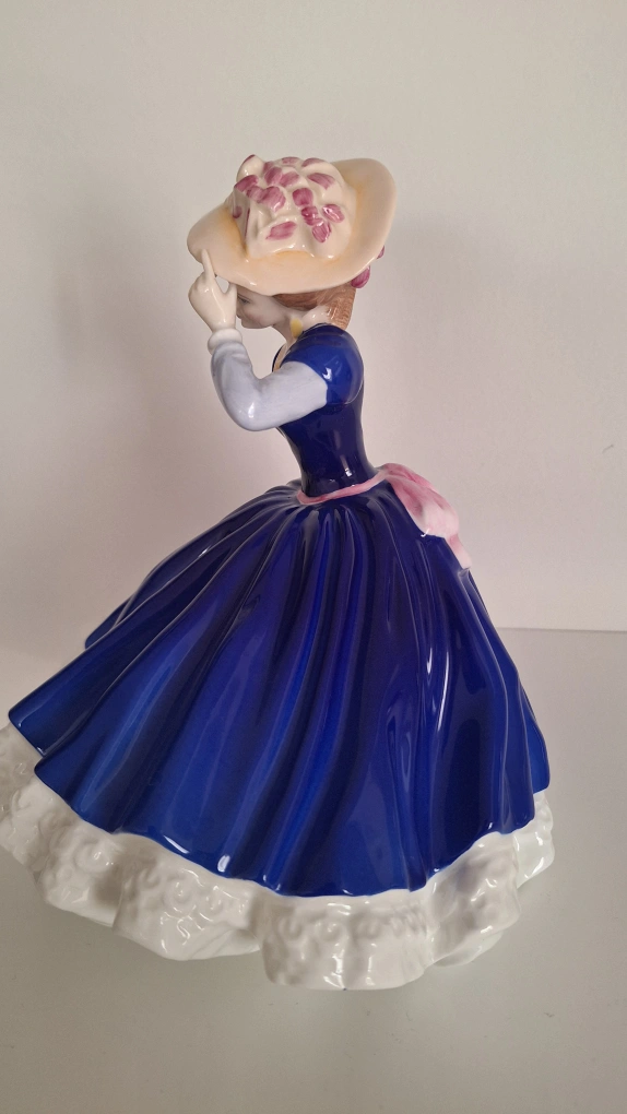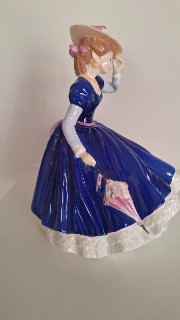 Royal Doulton Figure of the Year 'Mary'- 1992, VIntage Rare Royal Doulton figurine of a lady wearing a blue dress, holding a pink umbrella. She is wearing a hat with pink flowers and a pink ribbon around her waist. Made in England.