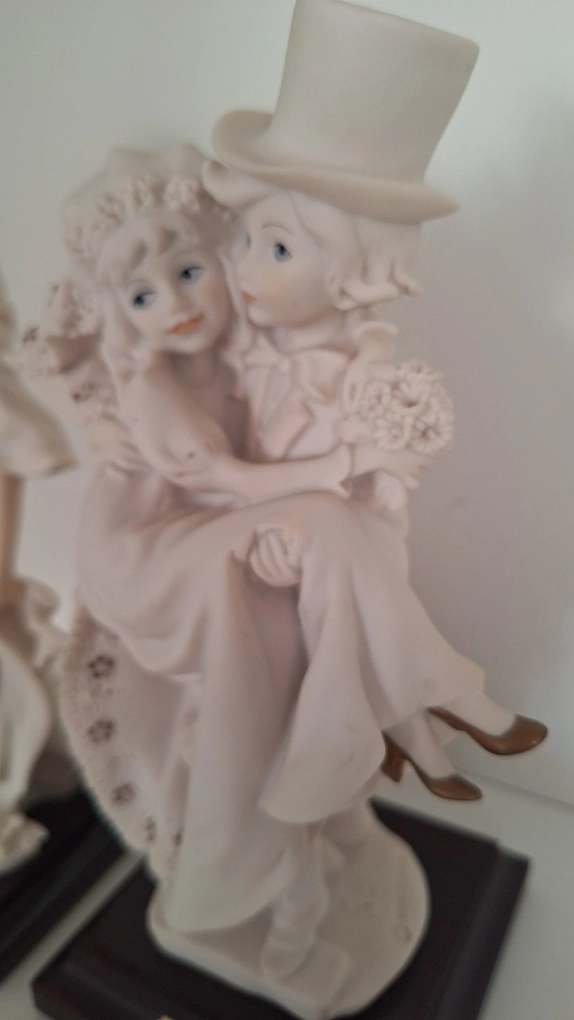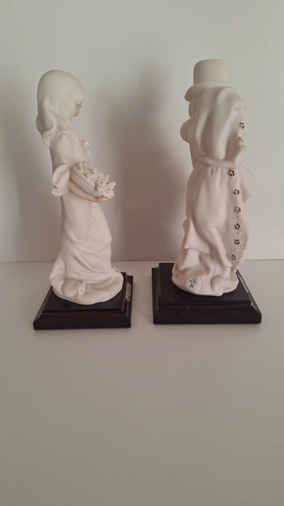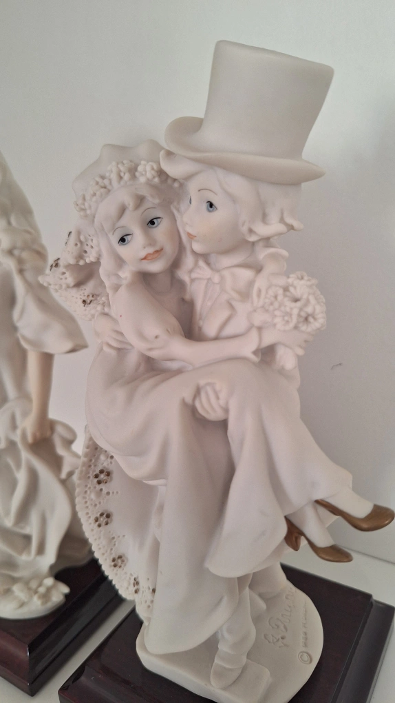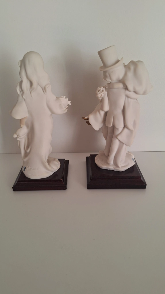 Set of two porcelain figurines. One figurine depicts a bride and groom. The other figurine depicts a woman holding a bouquet of flowers. Made in Italy