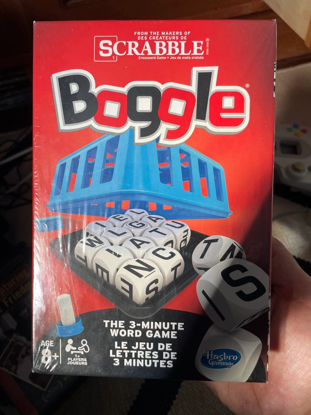 The 3-minute word game. Includes a blue plastic cube holder and letter dice.