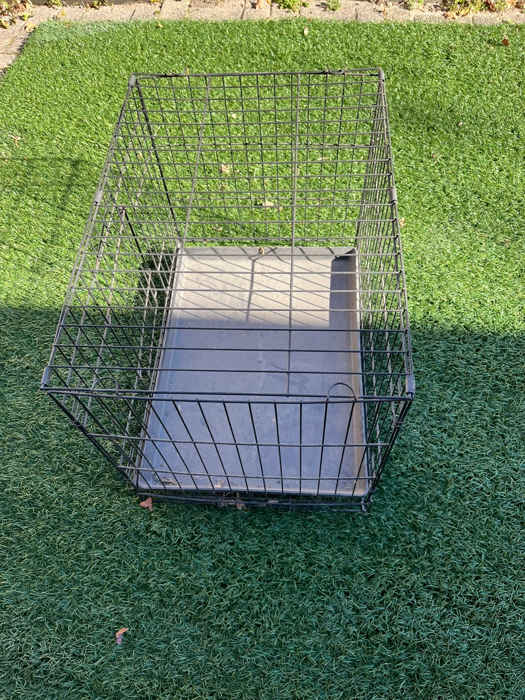 Black metal dog crate with removable plastic tray. For small dog. Includes a plastic cone collar.
