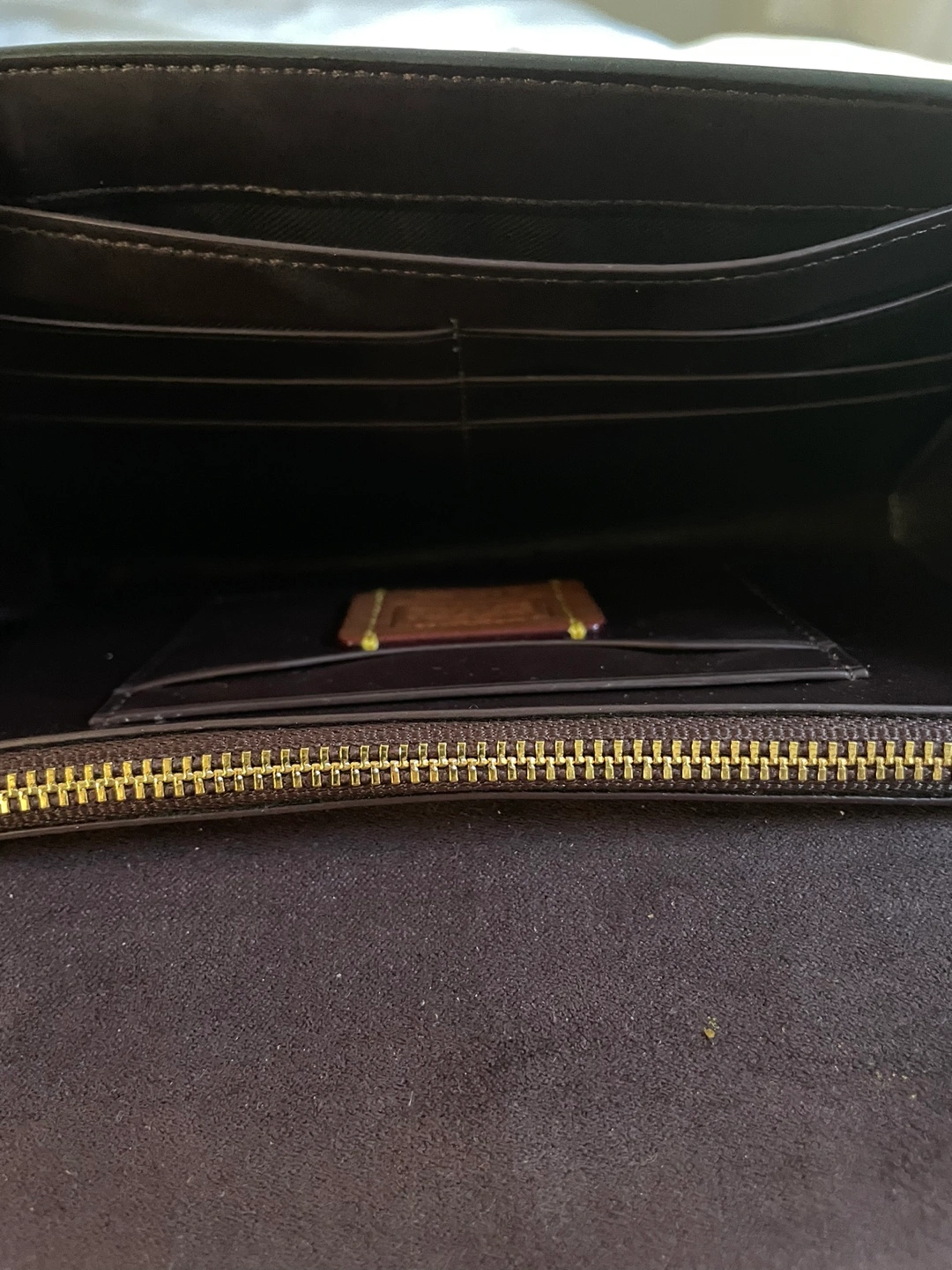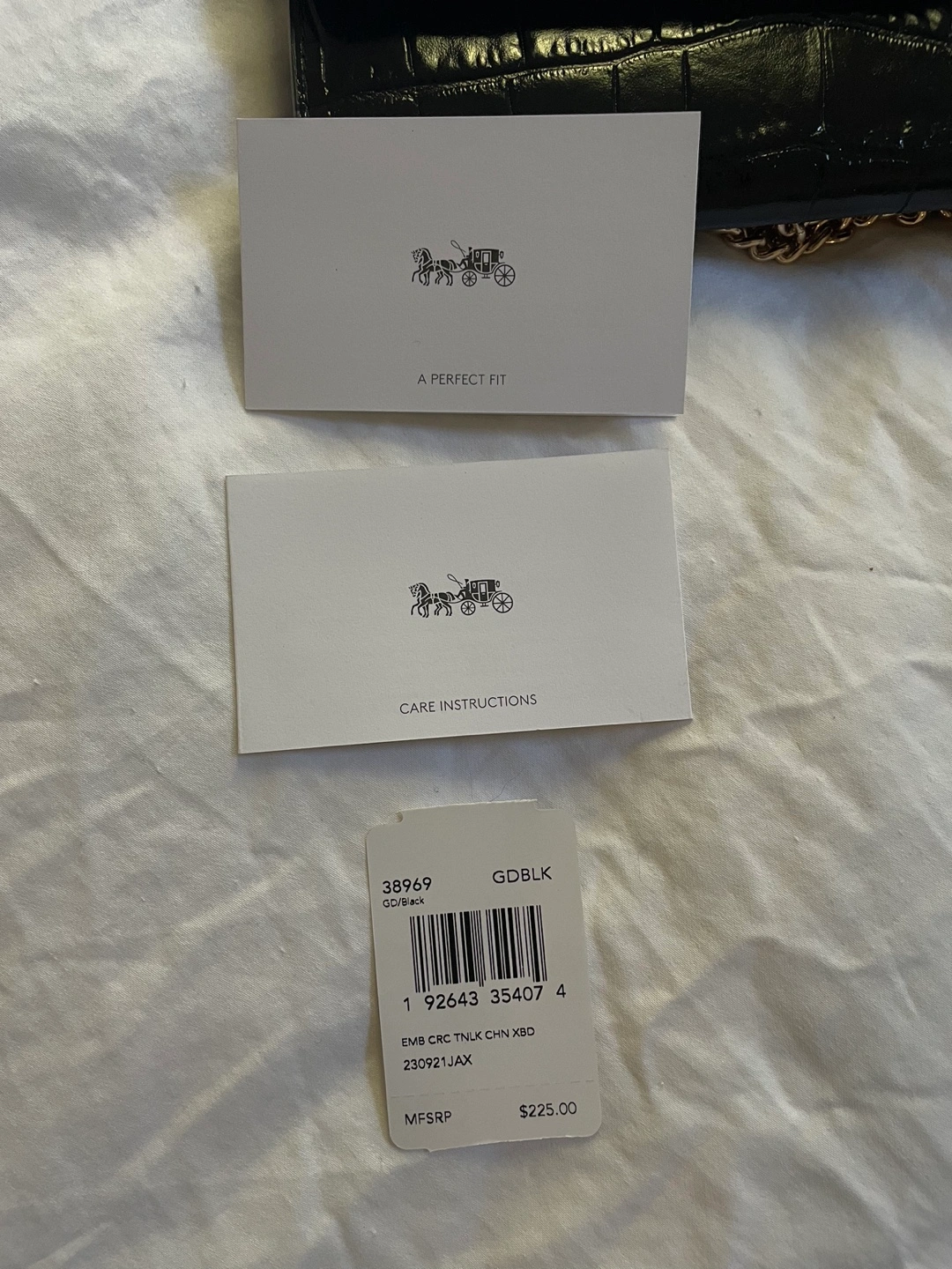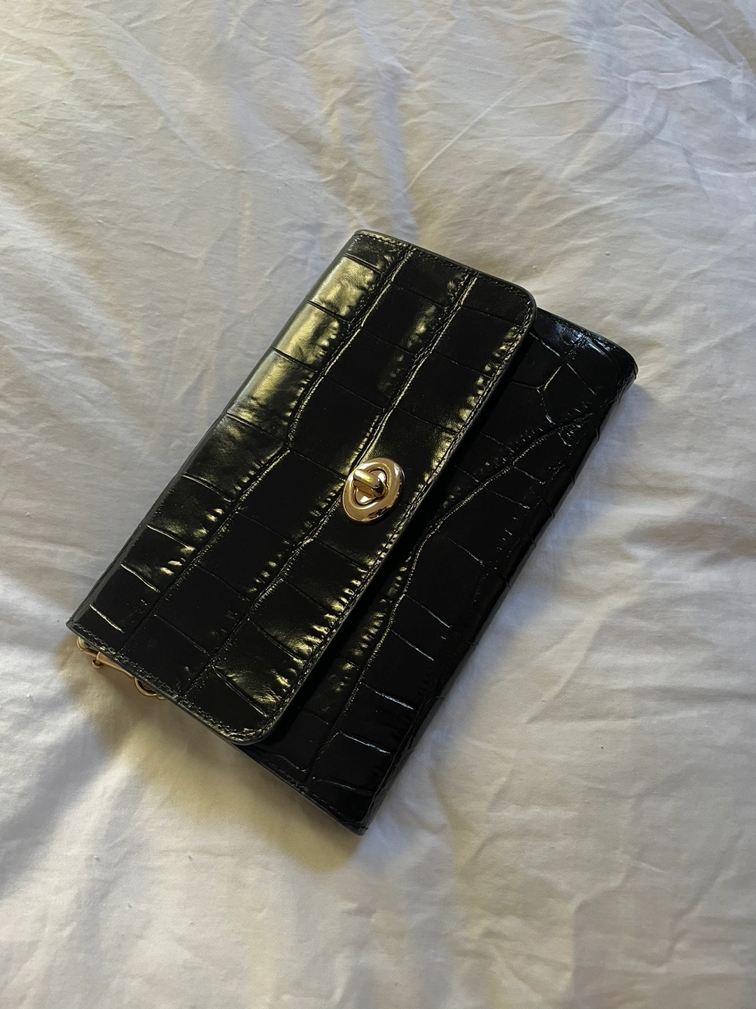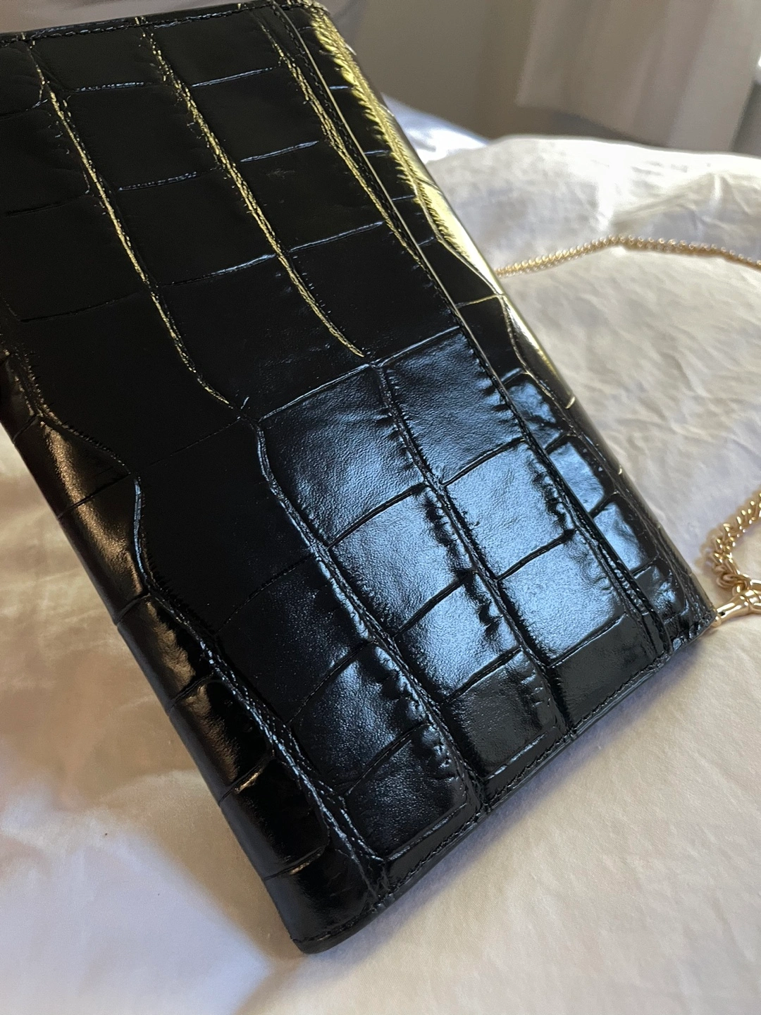 Black crocodile embossed leather crossbody bag with detachable gold chain strap and hardware. Multiple card slots, a zippered pocket, and a large slip pocket. Soft, fabric inner lining.