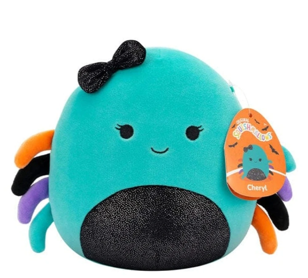 Cheryl is a teal spider with eight creepy, crawly legs. Her legs are orange, black, purple, and teal and are different on either side. She has a black sparkly belly and wears a bow the same color. She has round, black eyes with short dual lashes, and a black, smiling mouth.