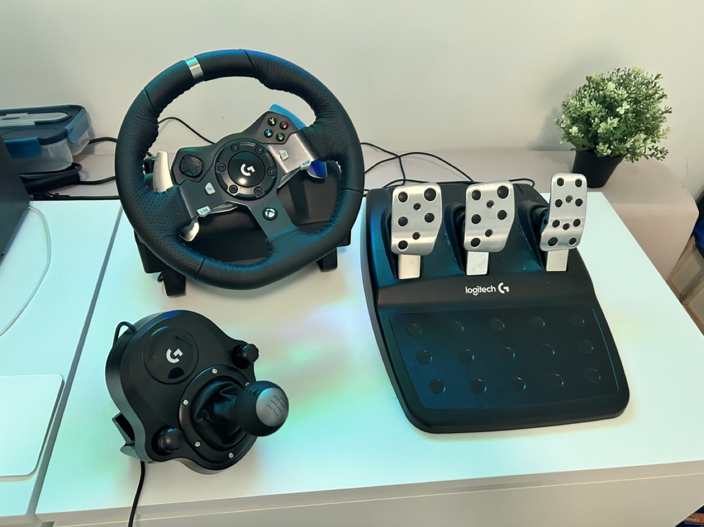 Steering wheel, pedals, and H shifter. Includes all cables and mounting hardware. Very minimal usage and in excellent condition.