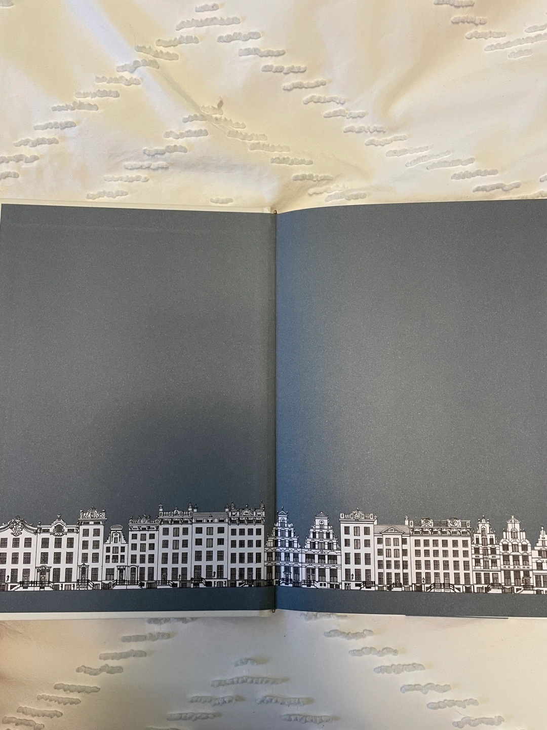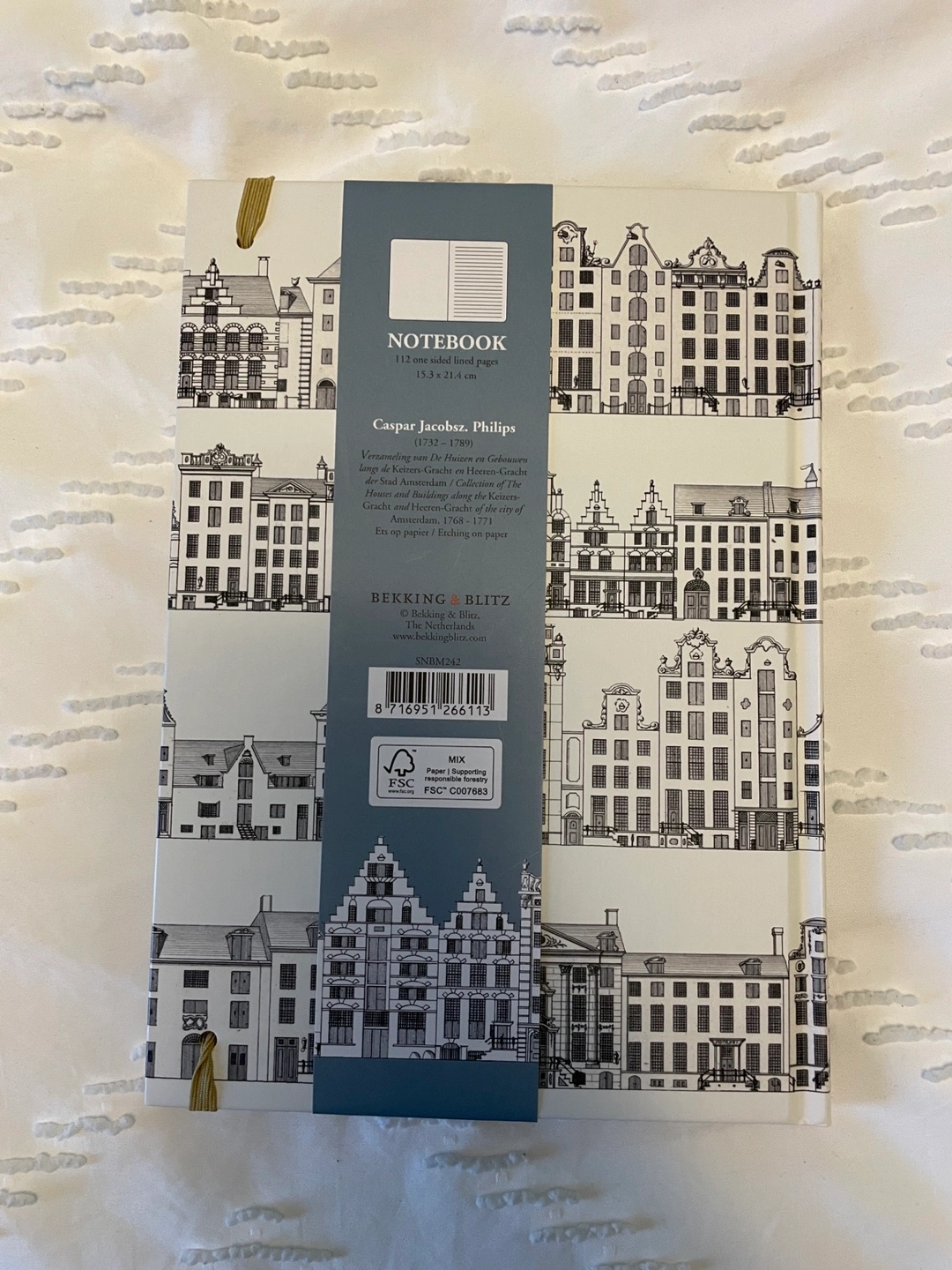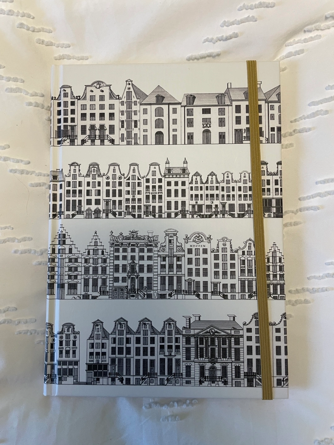 Notebook with lined paper, has a gold elastic band. A cityscape design is on the cover.