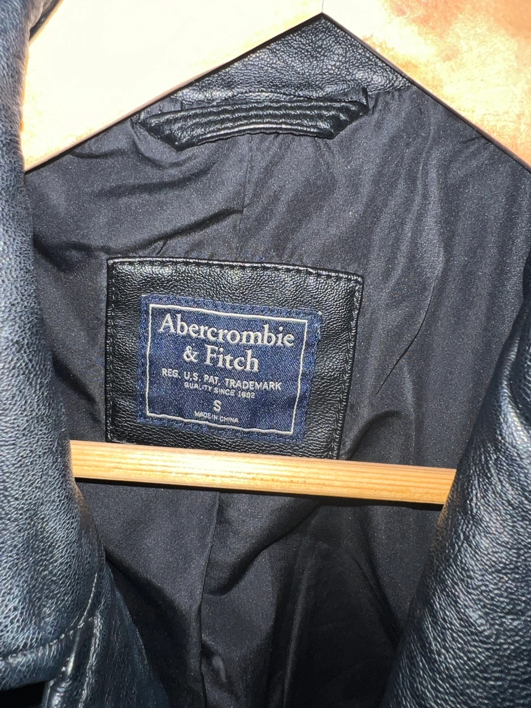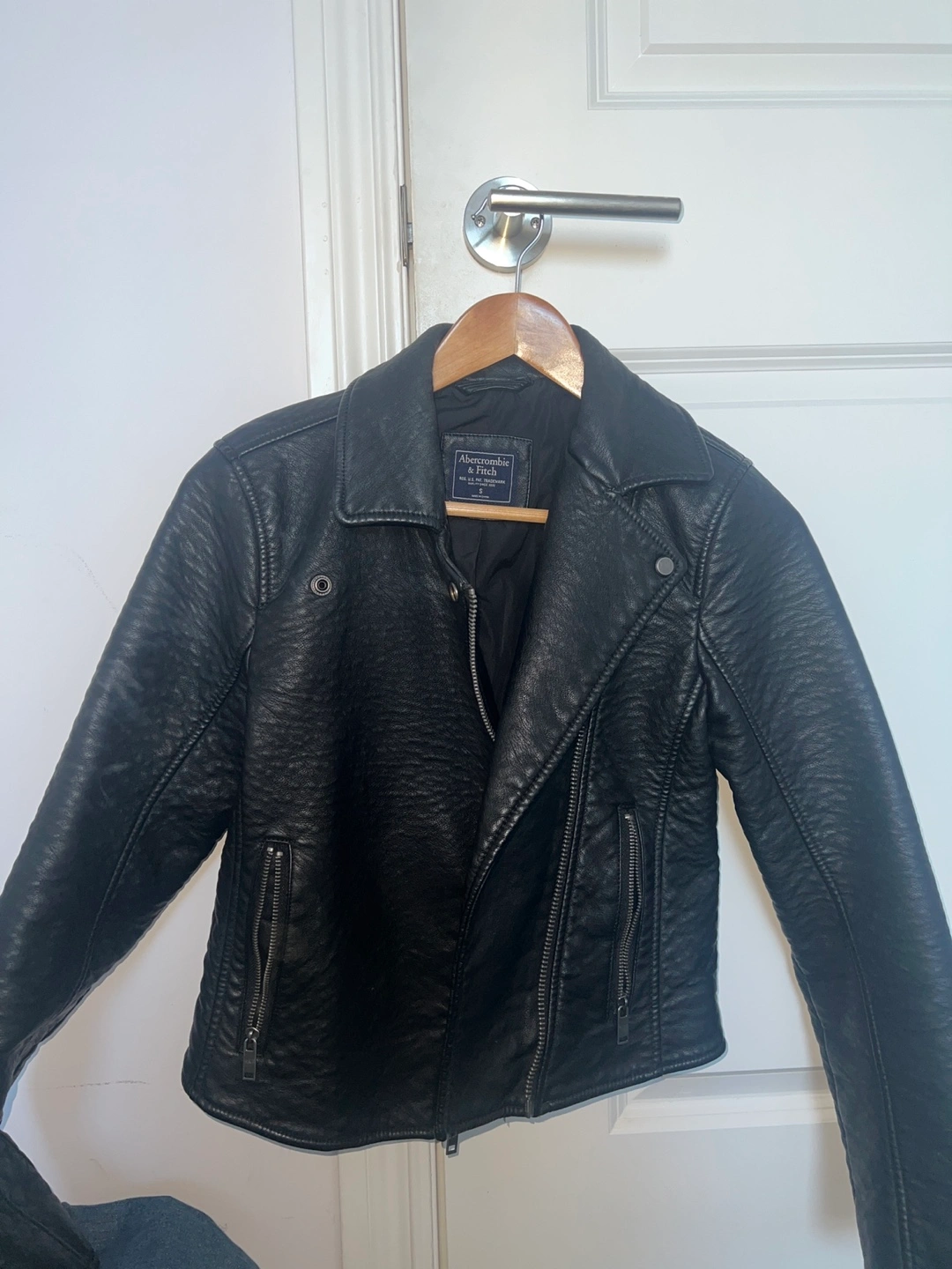 Women Black leather jacket, size S. Features a zipper closure, two zippered pockets, and a classic biker style.