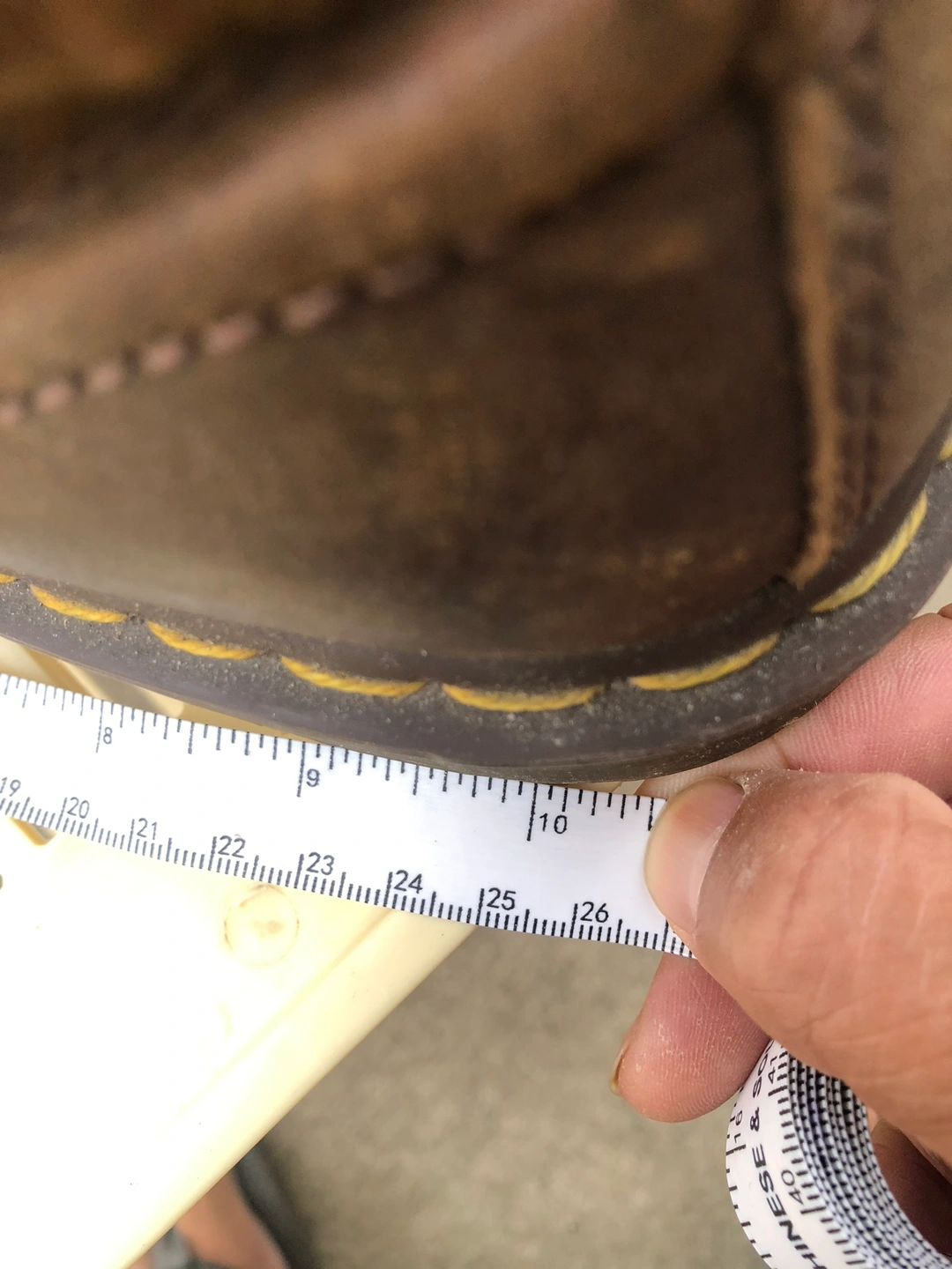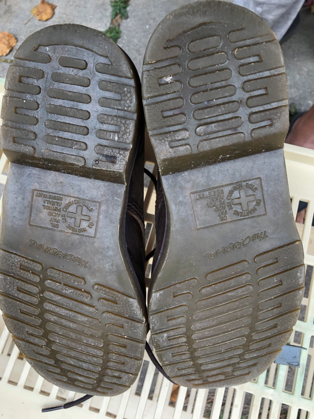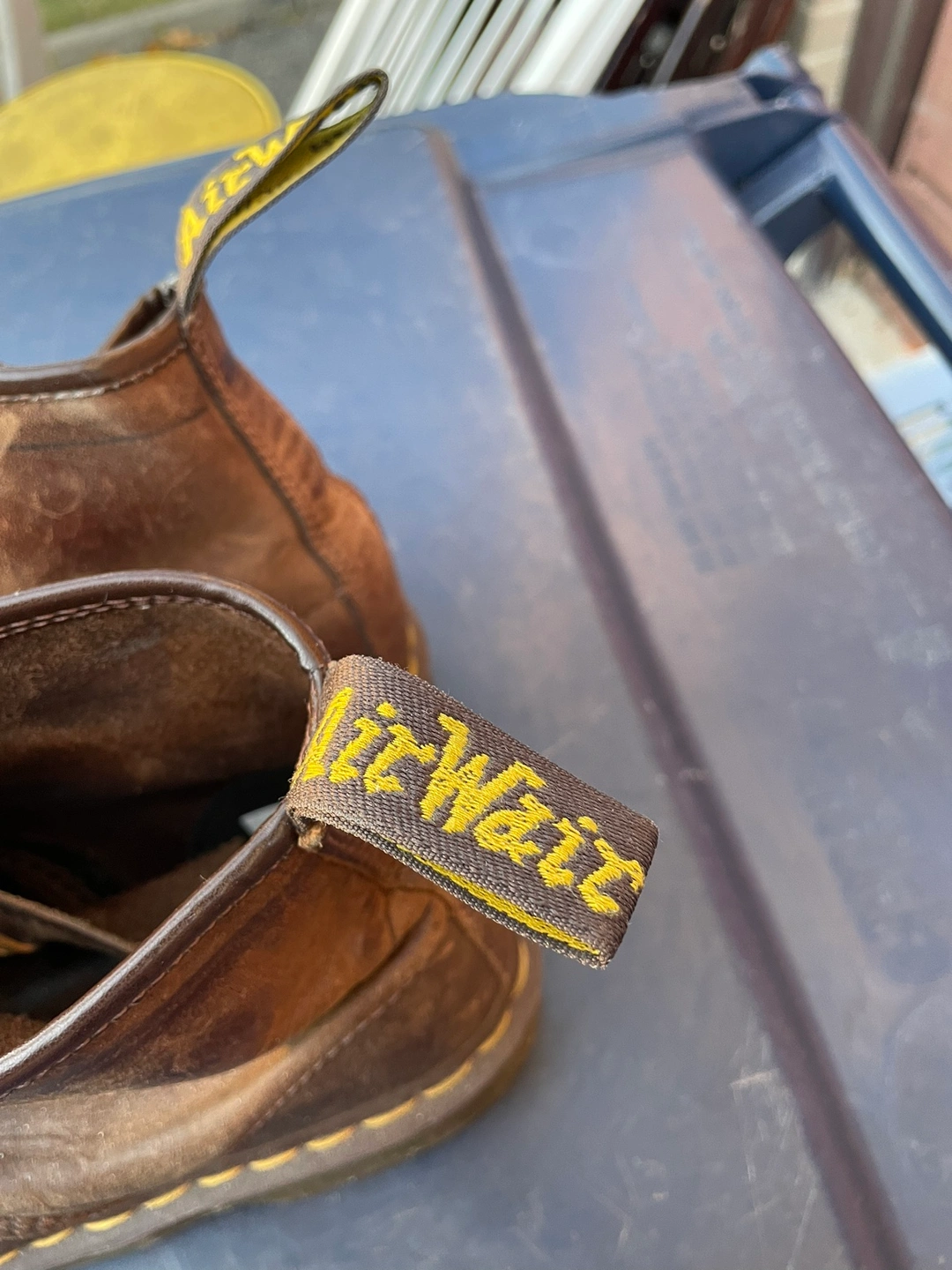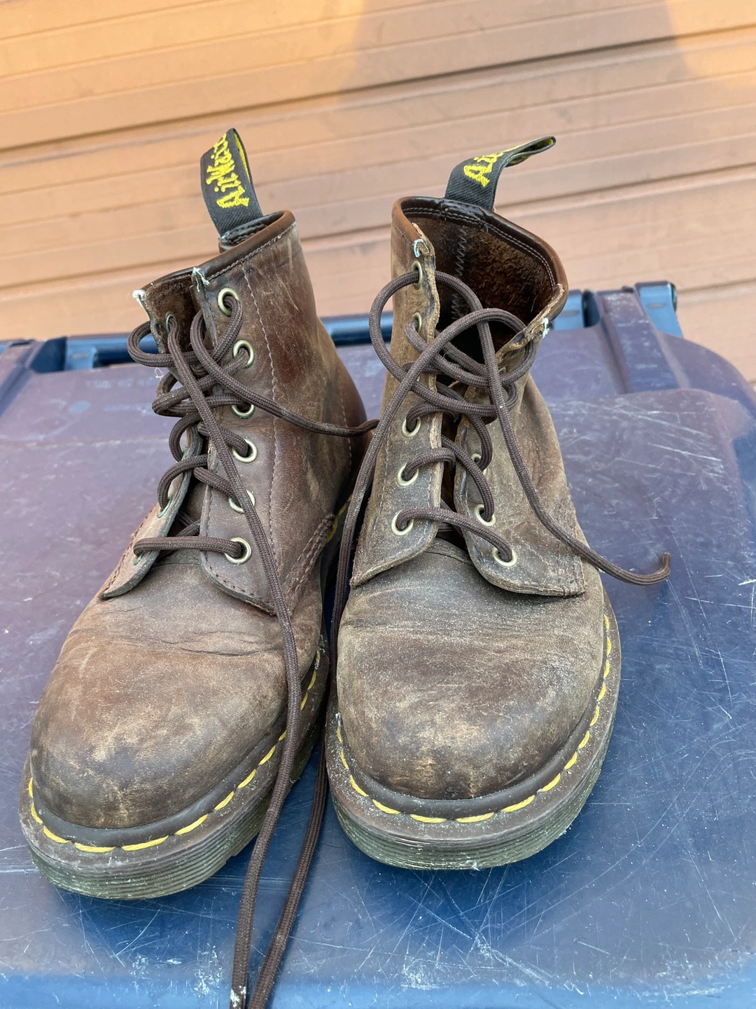 228Brown leather boots with yellow stitching and laces. Worn with some scuffs and scratches.