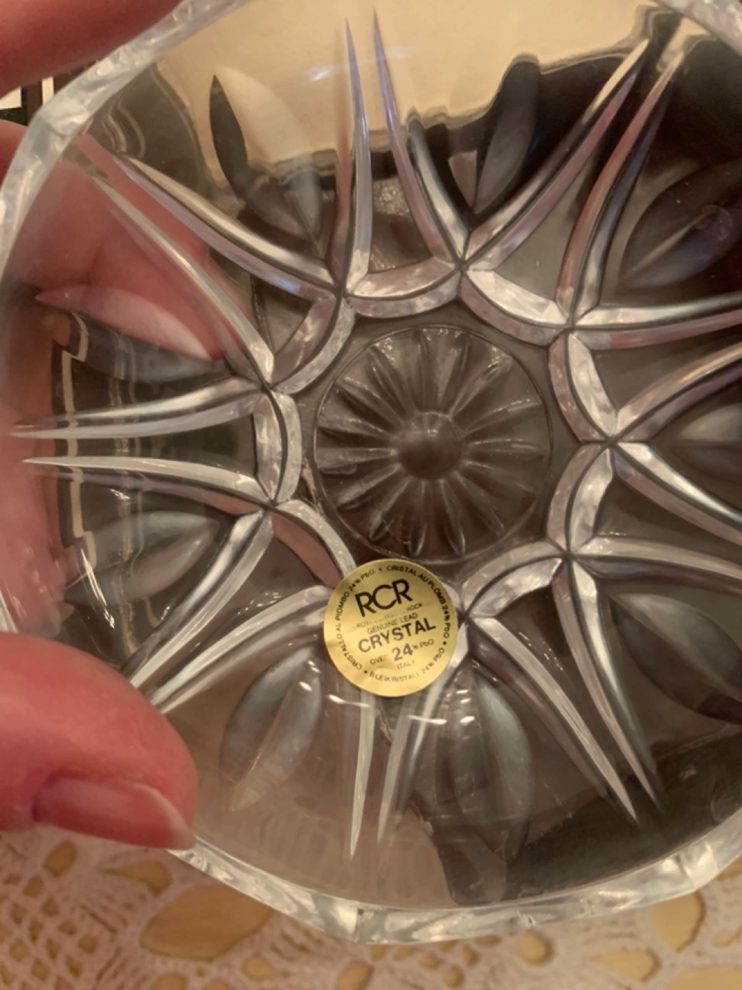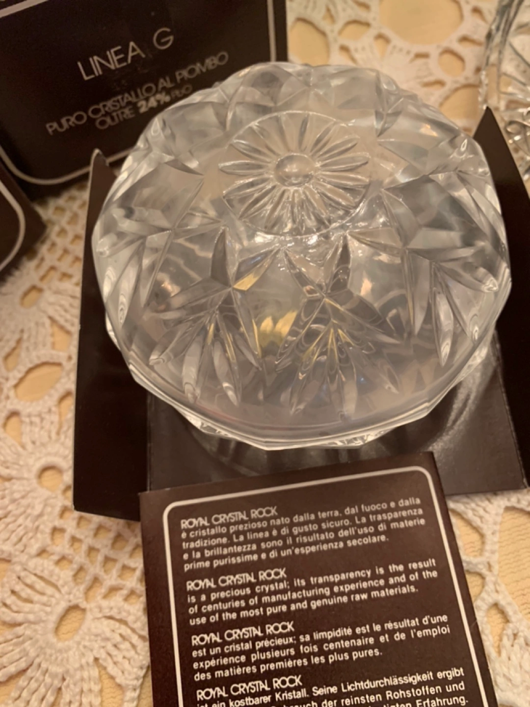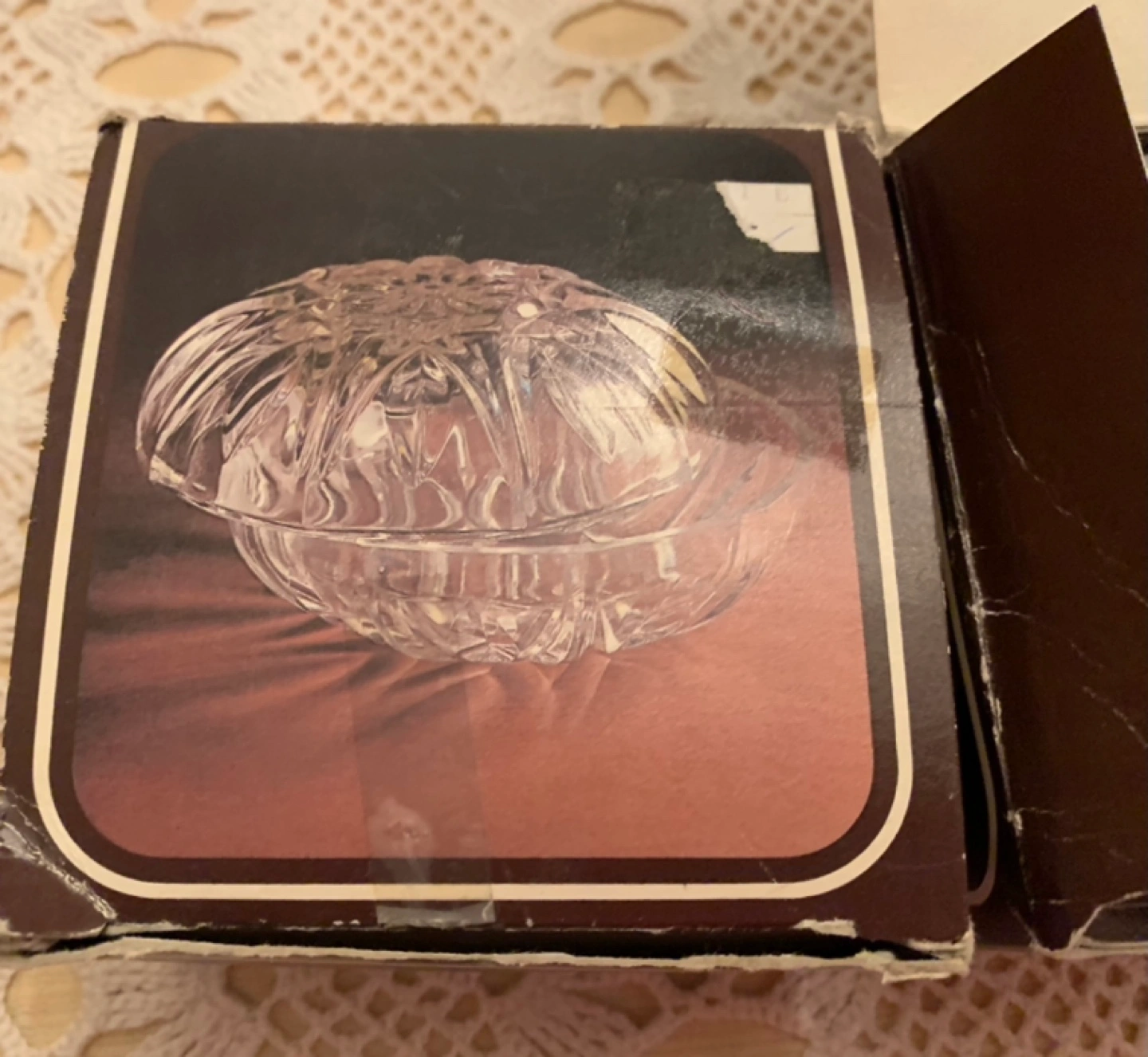 Crystal trinket box in the shape of a flower. Has a lid.
