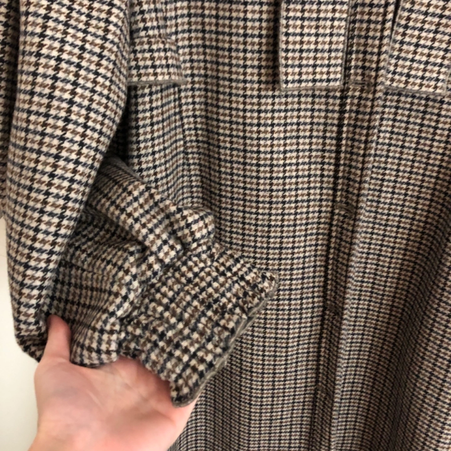 Brown, black, and beige houndstooth patterned coat with a tie at the neck and button closure. Long sleeves with elastic cuffs.