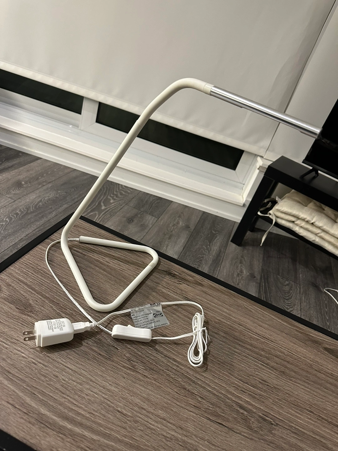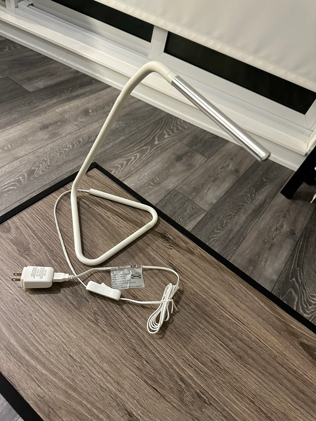 White desk lamp with a triangular base. Comes with a cord and adapter. Flexible neck. Light is on the top of the arm.