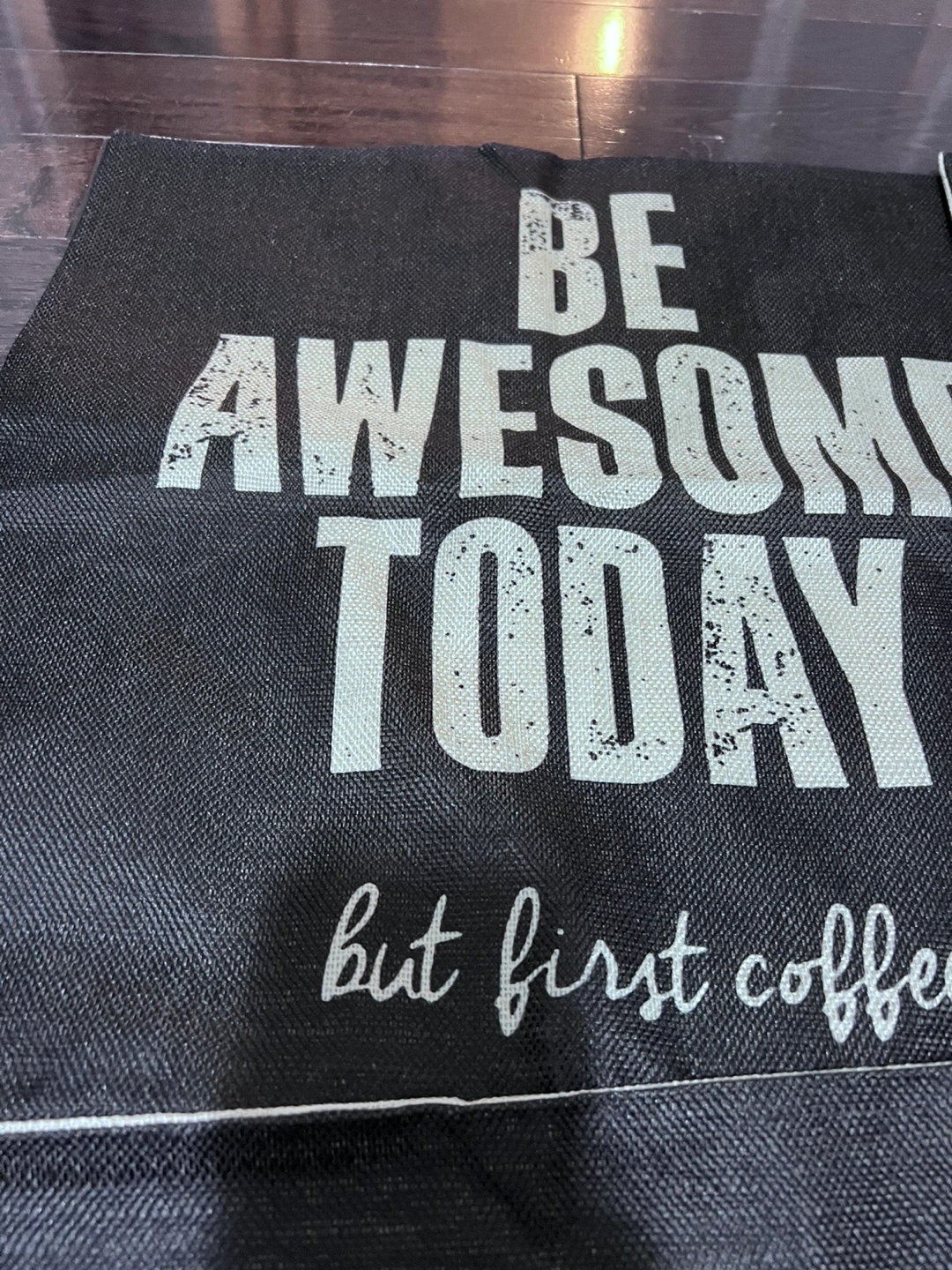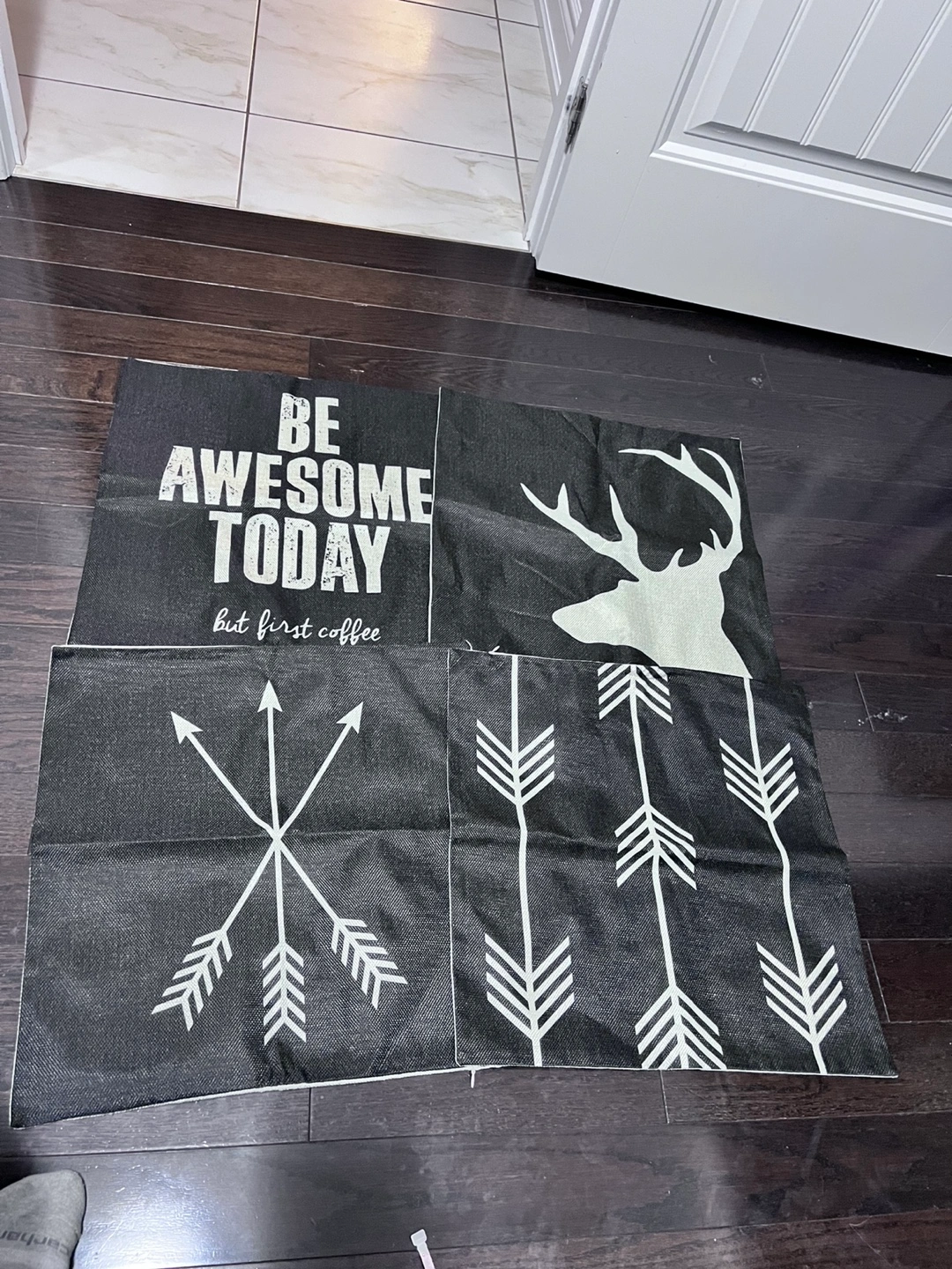 248Set of 4 decorative throw pillow covers with zipper. Black with cream designs. Includes deer, arrows and the phrase 'be awesome today, but first coffee'. Fabric is a rustic canvas-like. 17” covers made for 16 x 16 pillow inserts. Purchased for staging but never used.
