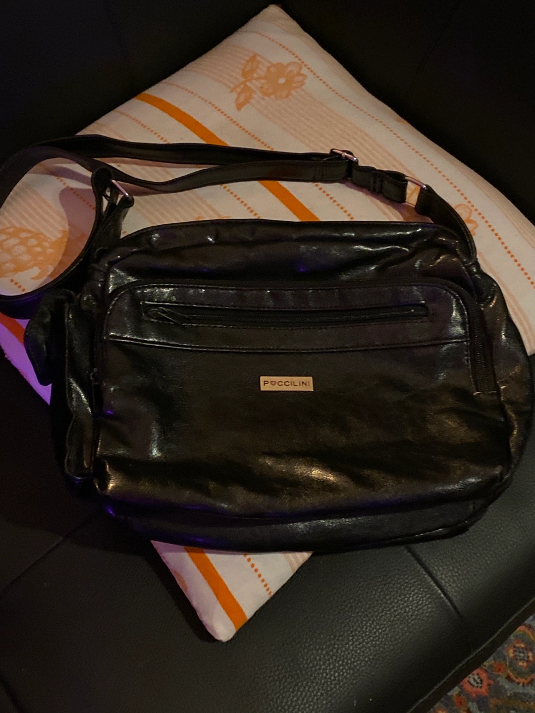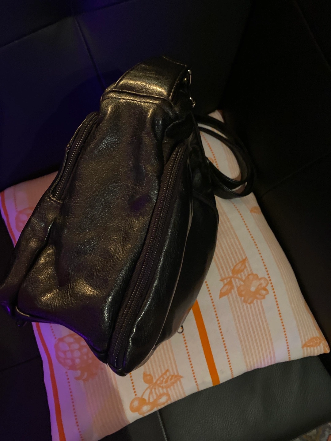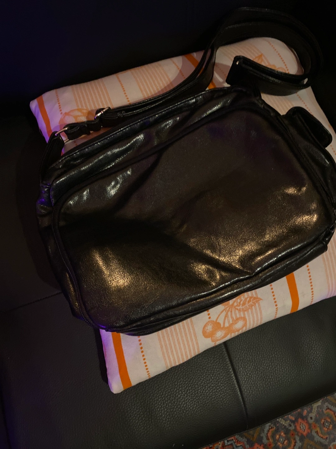 Vintage, Black leather shoulder bag with zipper closures. Slightly extendible. 5 zippered compartments. Adjustable strap. Very light and soft. Great for elderly with older small cell phones.