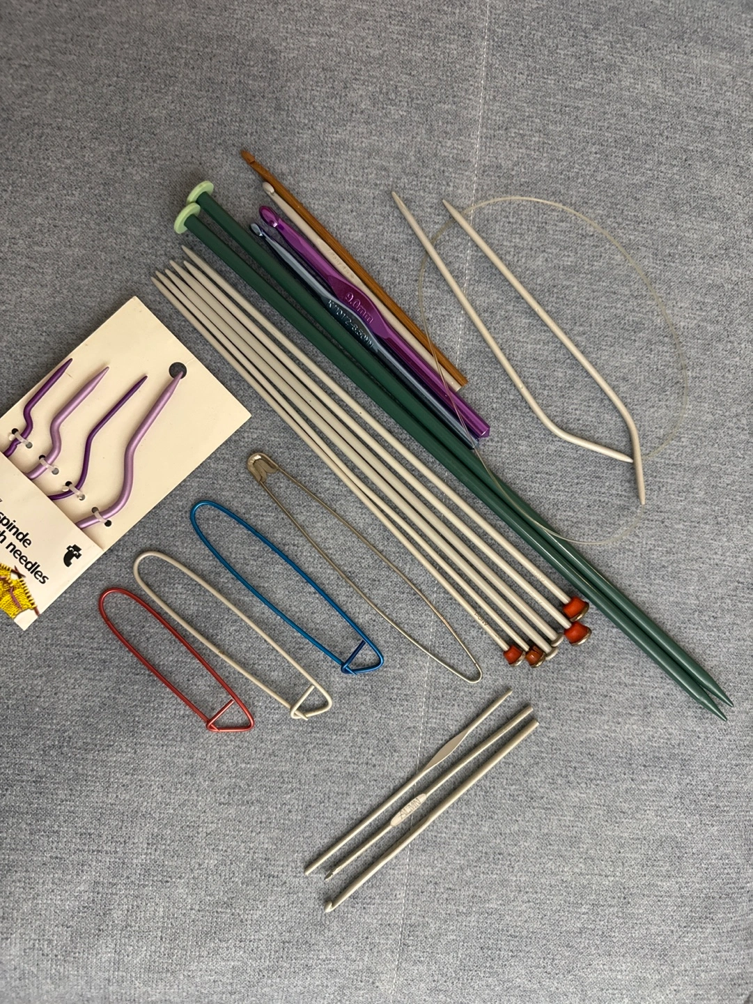 Knitting needles and crochet hooks in various sizes and colours. Includes safety pins and a circular needle.