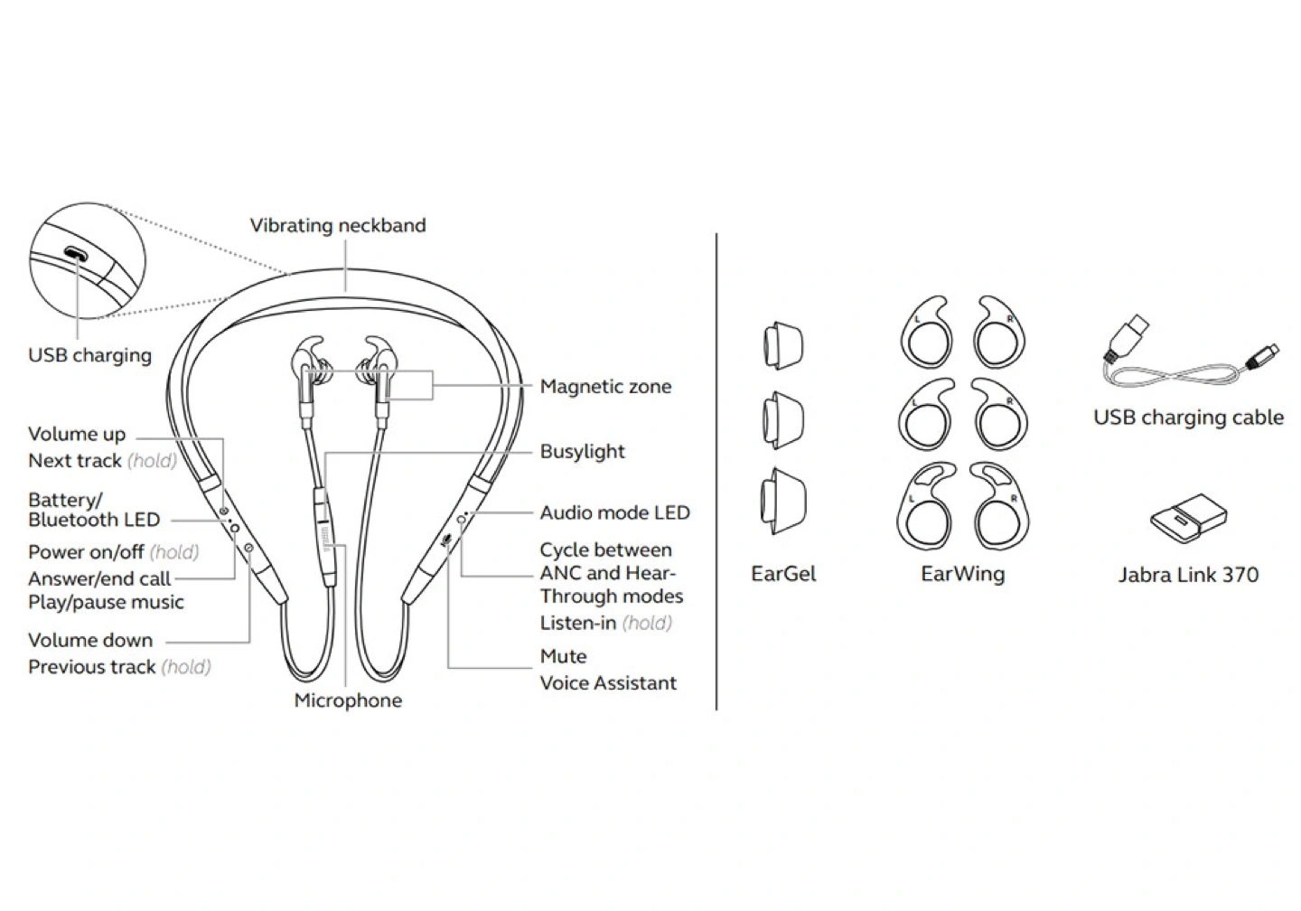 Designed for more than just work, the Evolve 75e Wireless Earbuds from Jabra features many helpful functions for most users. For communication, it features a three-microphone design to ensure that you're heard while also filtering out outside noises. Additionally, it provides you with both passive and active noise cancellation, allowing you to hear clearly. An integrated "busylight" lets others know when you don't want to be disturbed. Located on the neckband are five buttons for quick controls of calls and music, and built-in vibration provides you with silent notifications. Included are a pack of EarGel and EarWings for multiple fitting options.